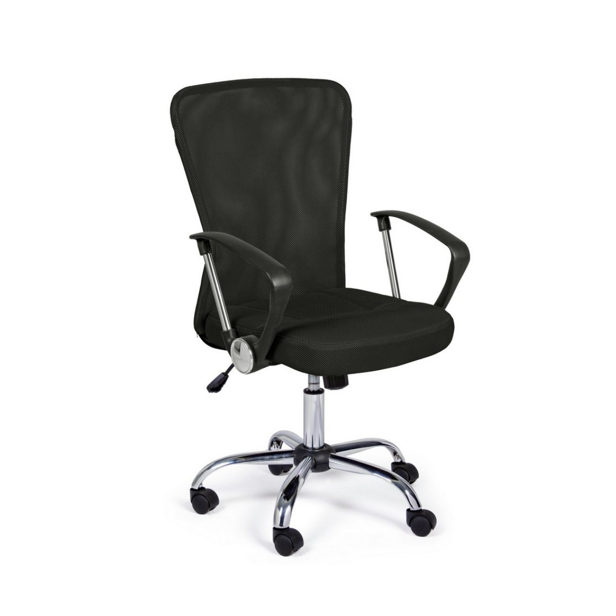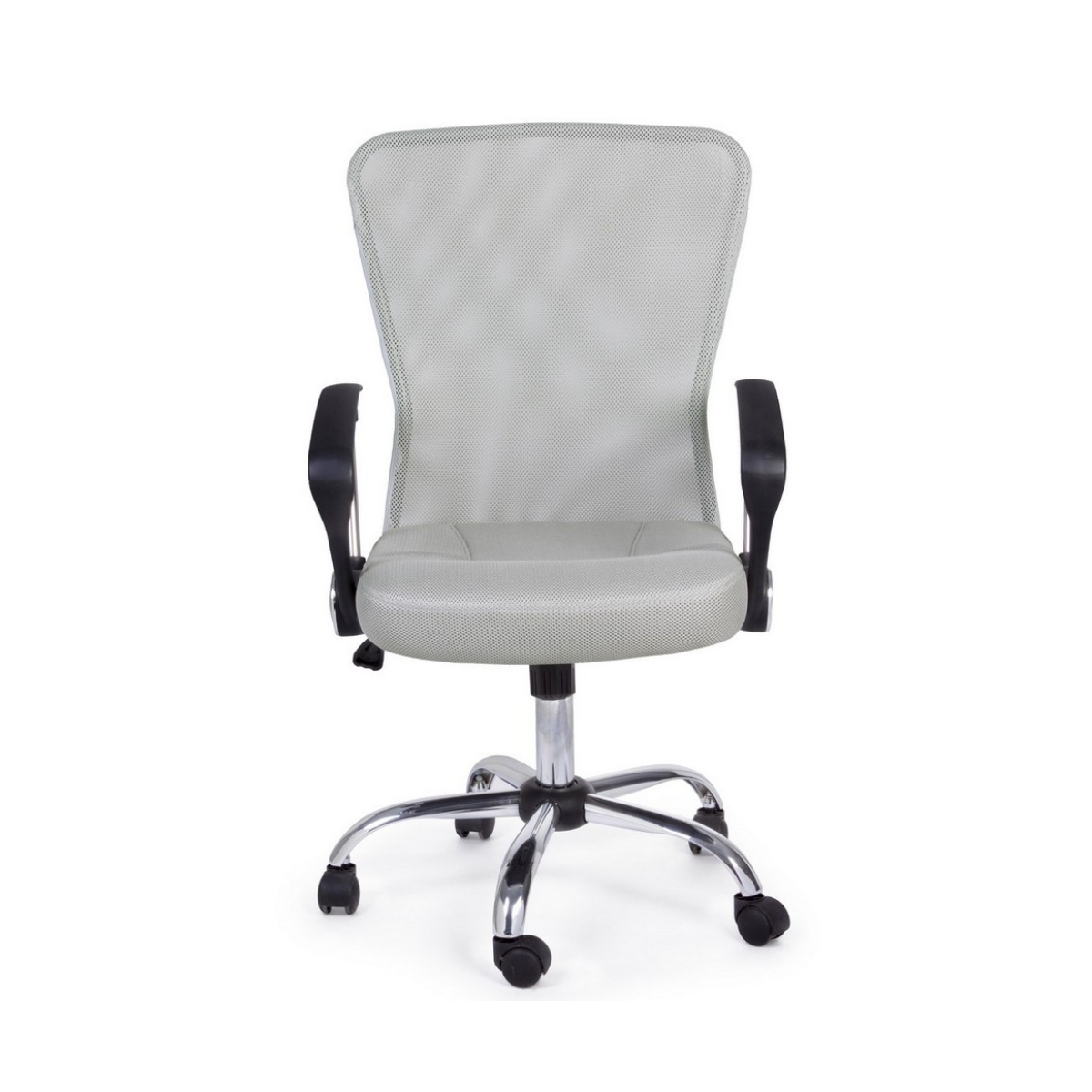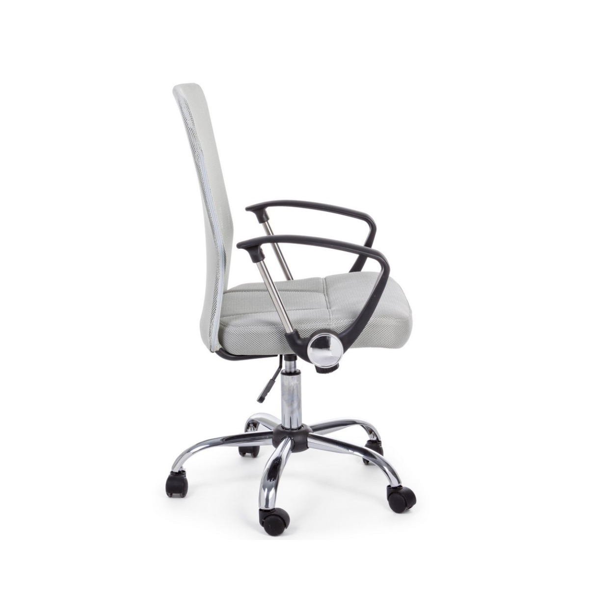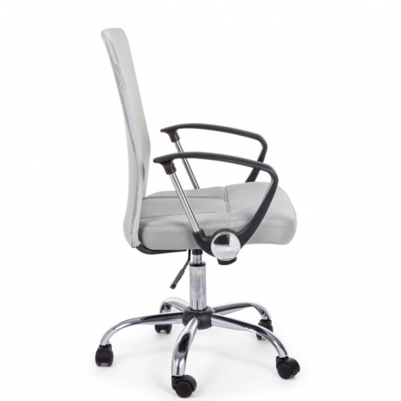 La base in acciaio cromato da 56 cm di diametro assicura stabilità e un tocco elegante, mentre le ruote in nylon scorrono con fluidità su ogni superficie. La seduta imbottita è rivestita in tessuto a rete 100% poliestere, traspirante e resistente, pensata per offrire il massimo comfort anche nelle giornate più lunghe. Lo schienale, anch’esso in rete, favorisce la ventilazione e sostiene la postura in modo ergonomico.