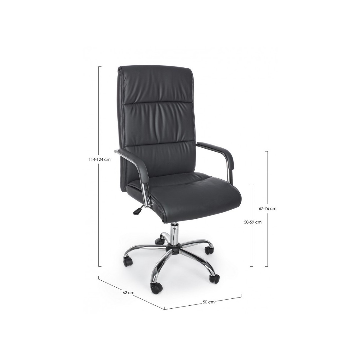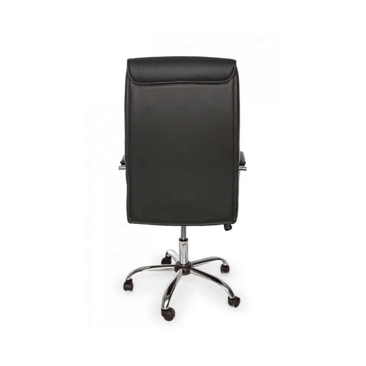 BASE IN ACCIAIO CROMATO Ø60 CM. RUOTE IN NYLON. SEDUTA E SCHIENALE IMBOTTITI E RIVESTITI IN SIMILPELLE. BRACCIOLI IN ACCIAIO CROMATO CON RIVESTIMENTO IN SIMILPELLE. ALTEZZA REGOLABILE.DA ASSEMBLARE