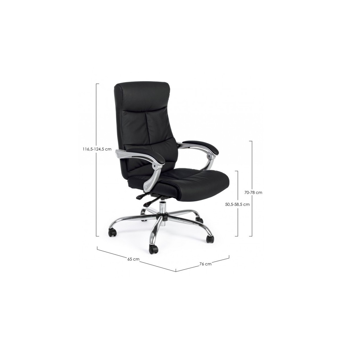 BASE IN ACCIAIO Ø76 CM. RUOTE IN NYLON. SEDUTA E SCHIENALE IMBOTTITI E RIVESTITI IN SIMILPELLE. BRACCIOLI IN PLASTICA (PP)CON POGGIABRACCIA RIVESTITO IN SIMILPELLE. ALTEZZA REGOLABILE E SCHIENALE RECLINABILE. DA ASSEMBLARE.