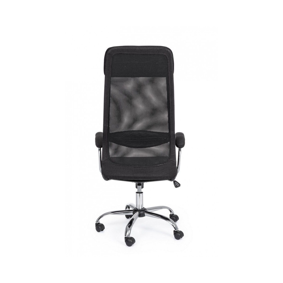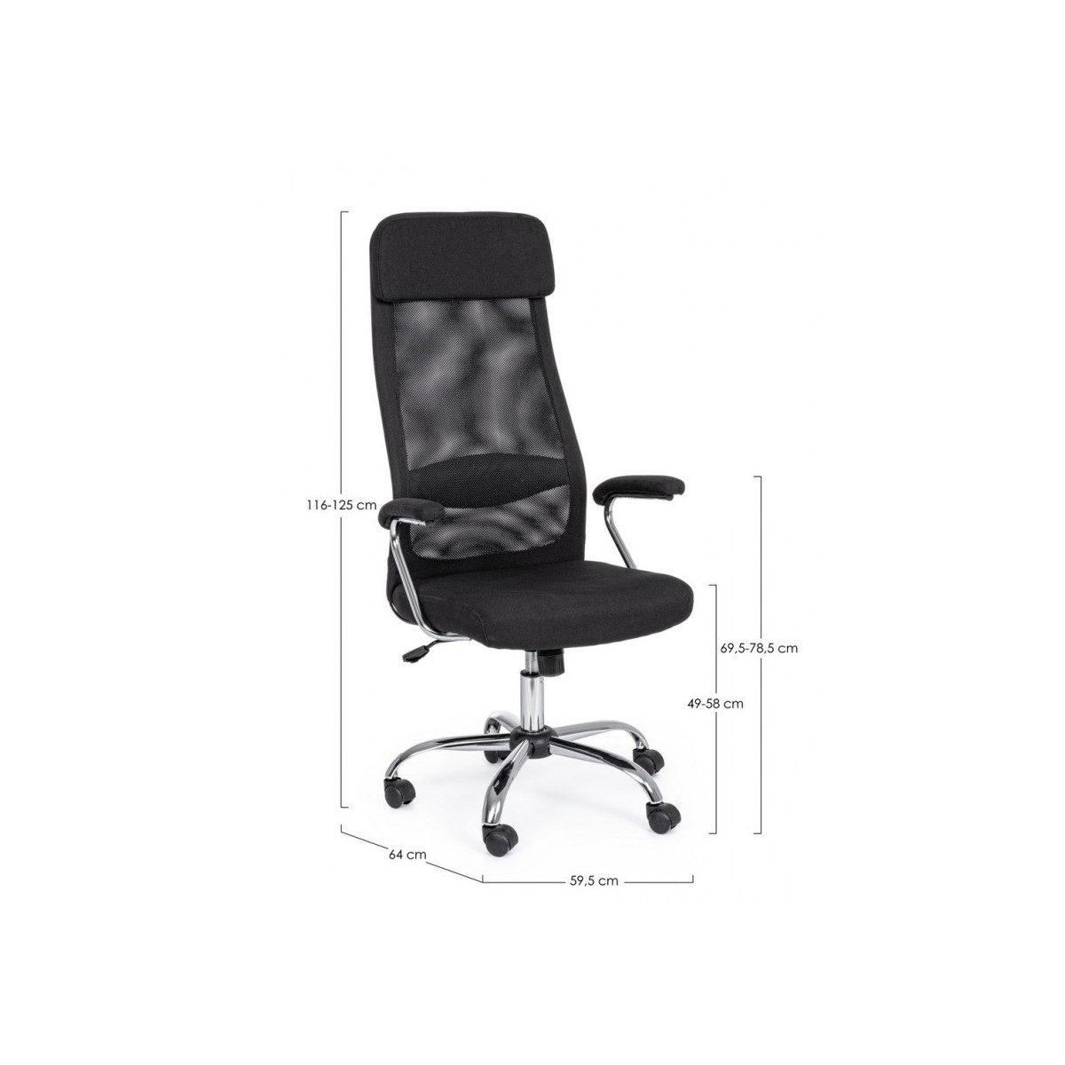 BASE IN ACCIAIO CROMATO Ø60CM. RUOTE IN NYLON. SEDUTA IMBOTTITA E RIVESTITA IN TESSUTO 100% POLIESTERE E TESSUTO A RETE CON INSERTO IN SIMILPELLE. BRACCIOLI IN PLASTICA (PP)E ACCIAIO CROMATO. ALTEZZA REGOLABILE. DA ASSEMBLARE.