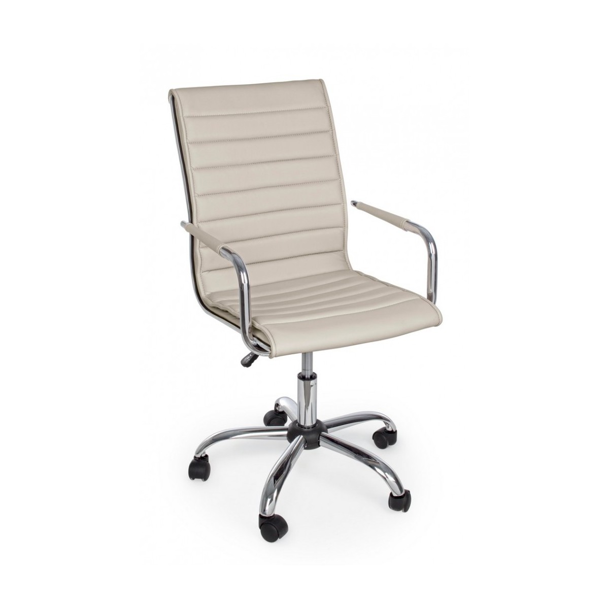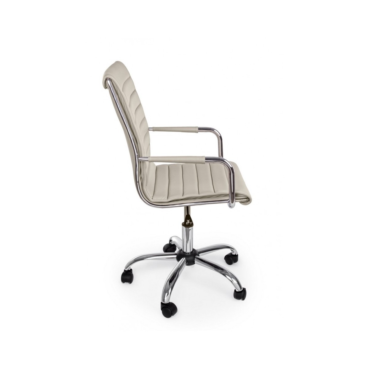 BASE IN ACCIAIO CROMATO Ø56 CM. RUOTE IN NYLON. SEDUTA E SCHIENALE IMBOTTITI E RIVESTITI IN SIMILPELLE. BRACCIOLI IN ACCIAIO CROMATO CON RIVESTIMENTO IN SIMILPELLE. ALTEZZA REGOLABILE. DA ASSEMBLARE