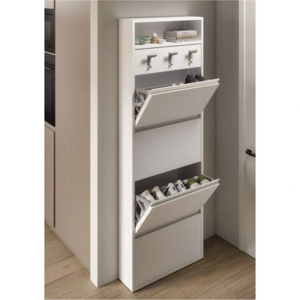 Scarpiera HOPLA' ART.951 con struttura in legno rivestito melaminico, con vano a giorno, pannello ruotante con 3 portabiti, e 4 ante ribalte