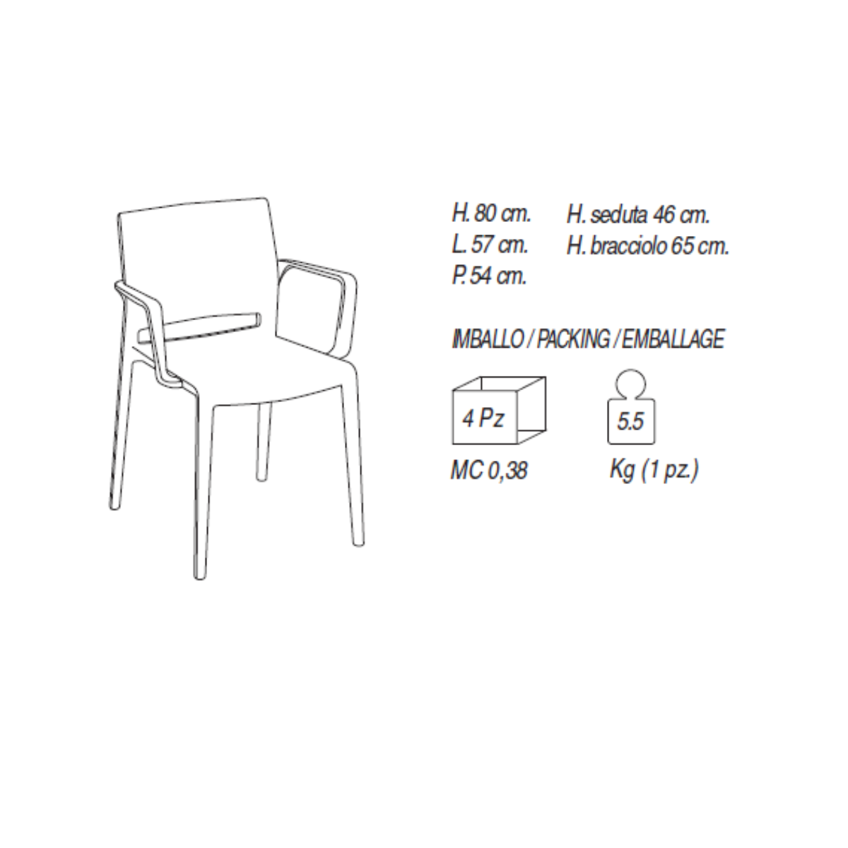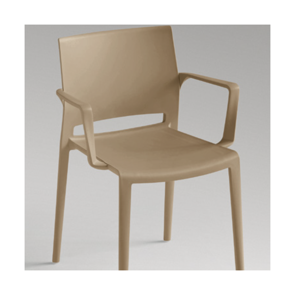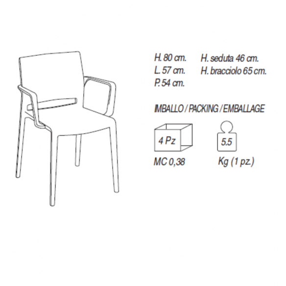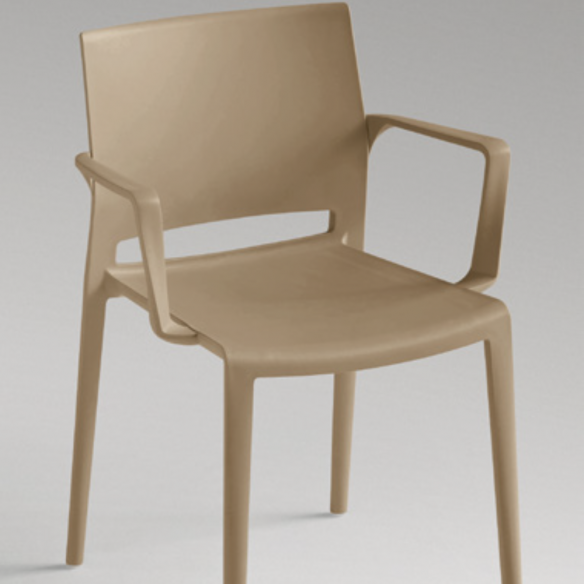 Sedia BAKHITA con braccioli realizzata interamente in polipropilene e disponibile in diverse colorazioni.