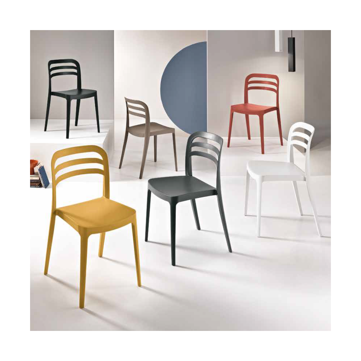 Sedia impilabile in polipropilene. Disponibile in diversi colori.