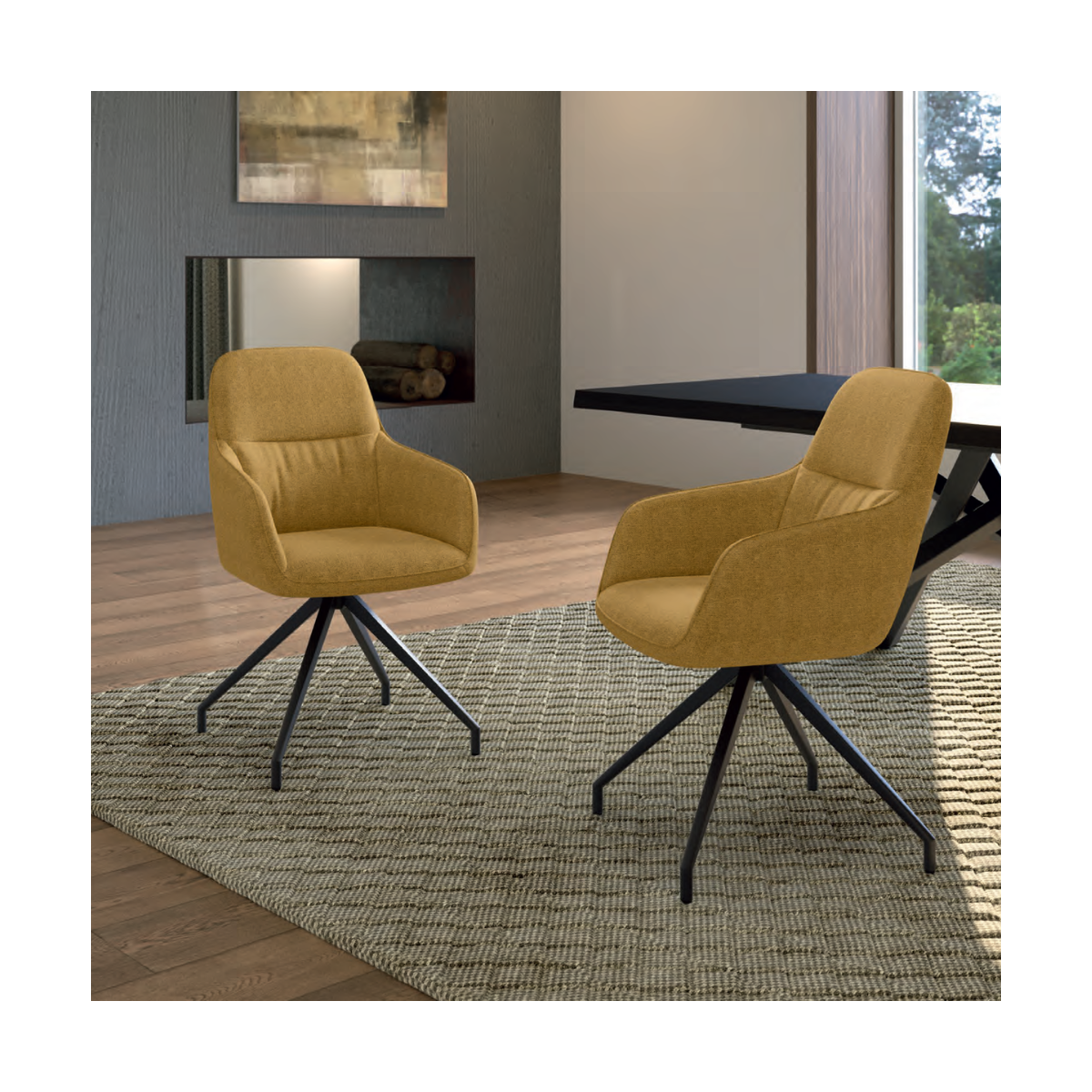 Abbinata a un tavolo moderno con base in metallo nero, la sedia GAIA crea un effetto di continuità armoniosa tra materiali e finiture, esaltando la coerenza stilistica dell’ambiente. È la scelta perfetta per chi cerca una sedia comoda, girevole e di design, capace di impreziosire qualsiasi zona living con personalità.
