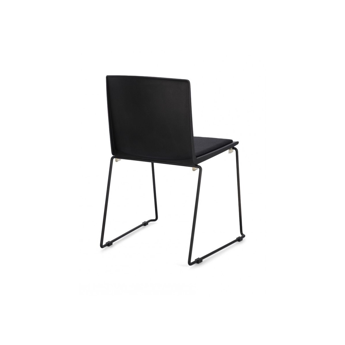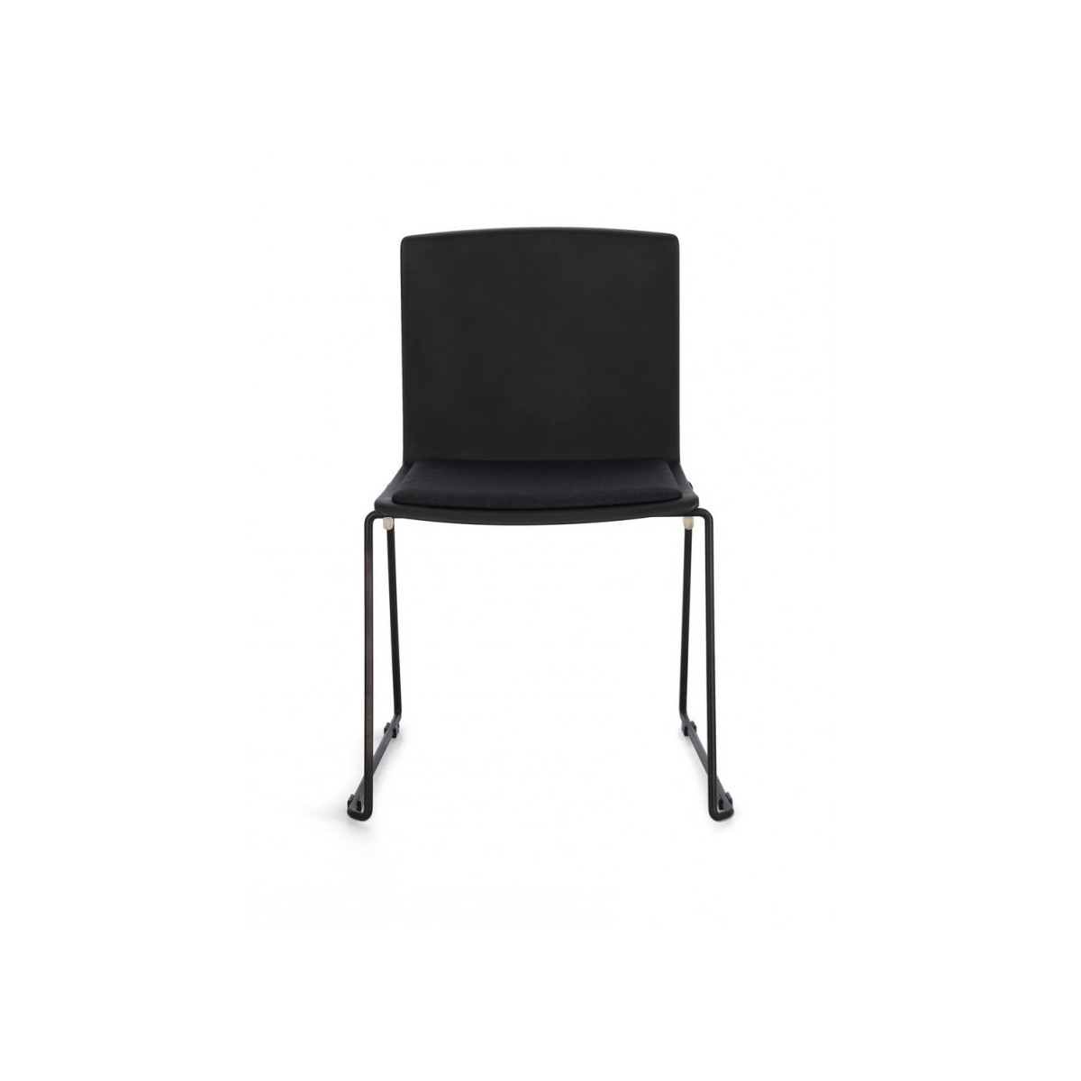 SEDUTA IN PLASTICA (PP). CUSCINETTO SEDUTA IN POLIESTERE. GAMBE IN ACCIAIO VERNICIATE A POLVERE EPOSSIDICA. IMPILABILE.