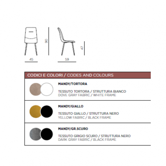 La sedia MANDY è progettata per offrire il massimo comfort grazie alla sua imbottitura ergonomica che supporta la postura corretta. Il tessuto di alta qualità non solo garantisce una lunga durata, ma aggiunge anche un tocco di eleganza e raffinatezza all'ambiente. La sedia è leggera e facile da spostare, rendendola ideale per diversi contesti, dai salotti alle sale da pranzo, dagli uffici agli spazi comuni.