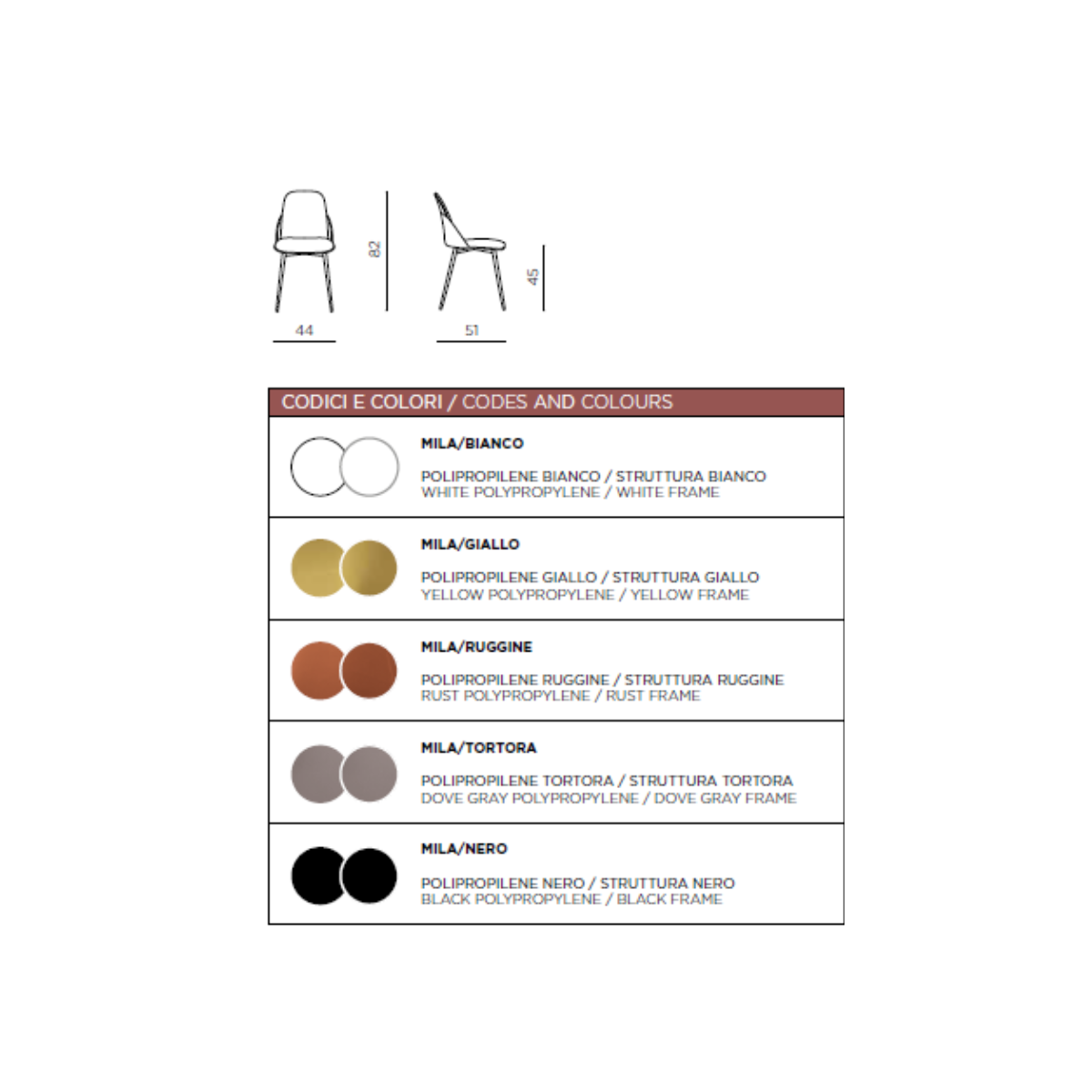 La sedia MILA è progettata per offrire comfort e stile. La seduta in polipropilene è ergonomica, fornendo un supporto adeguato per lunghe ore di utilizzo. La struttura in metallo aggiunge un tocco di eleganza e garantisce una lunga durata. Questa sedia è leggera, ma allo stesso tempo robusta, rendendola facile da spostare senza compromettere la stabilità.
