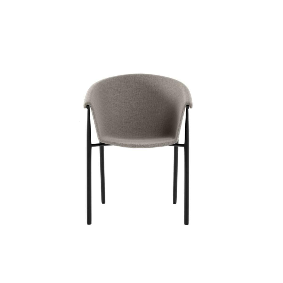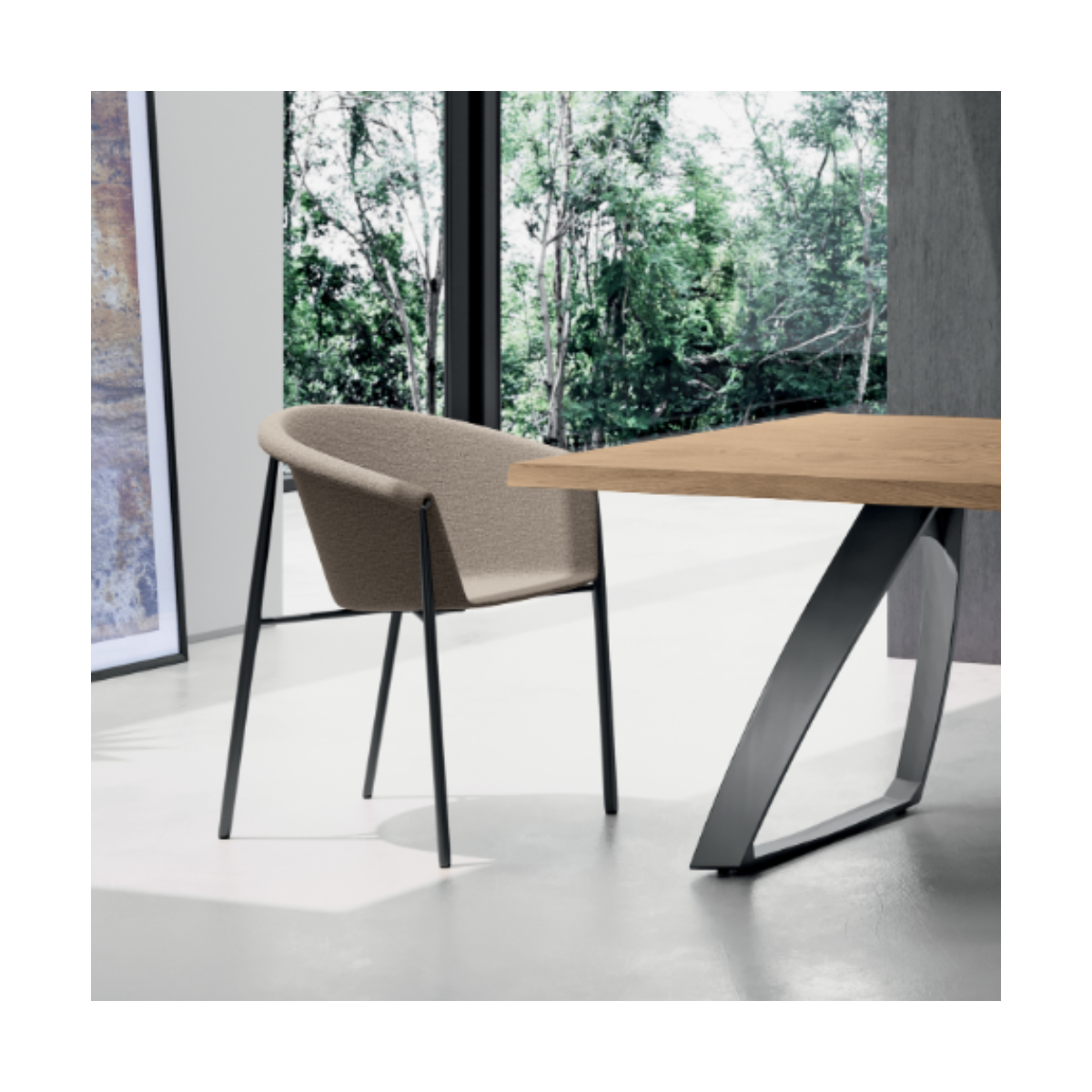 La struttura è realizzata in metallo verniciato nero, resistente e di forte impatto visivo, mentre la seduta è rivestita in morbido tessuto, disponibile in quattro eleganti varianti di colore. Ogni combinazione è pensata per adattarsi con gusto sia a cucine contemporanee che a zone pranzo più raffinate, portando un tocco di personalità all’ambiente.