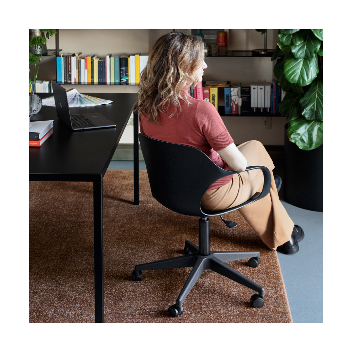 Realizzata con seduta in polipropilene riciclato al 100%, anche nella versione in materiale tipo Tetrapak, è una proposta eco-friendly pensata per gli ambienti di lavoro attenti all’ambiente. La struttura in nylon è solida e leggera, mentre l’alzata a gas consente una regolazione fluida dell’altezza per adattarsi a ogni esigenza.