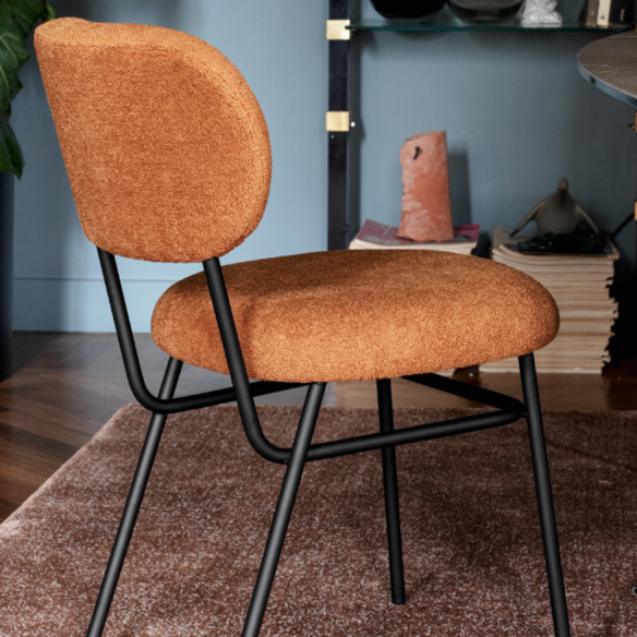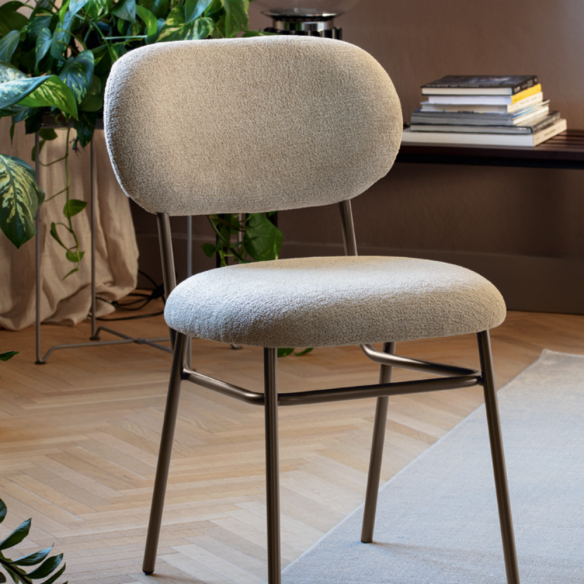 La struttura è realizzata in metallo verniciato leggero con tubolare sottile e lineare, mentre la seduta e lo schienale imbottiti sono rivestiti in morbido tessuto disponibile in diverse varianti colore, per adattarsi perfettamente a ogni stile d’arredo.