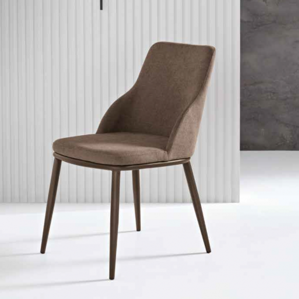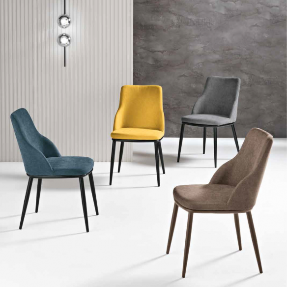 Sedia imbottita in tessuto con struttura in metallo verniciato. Disponibile in diversi colori.