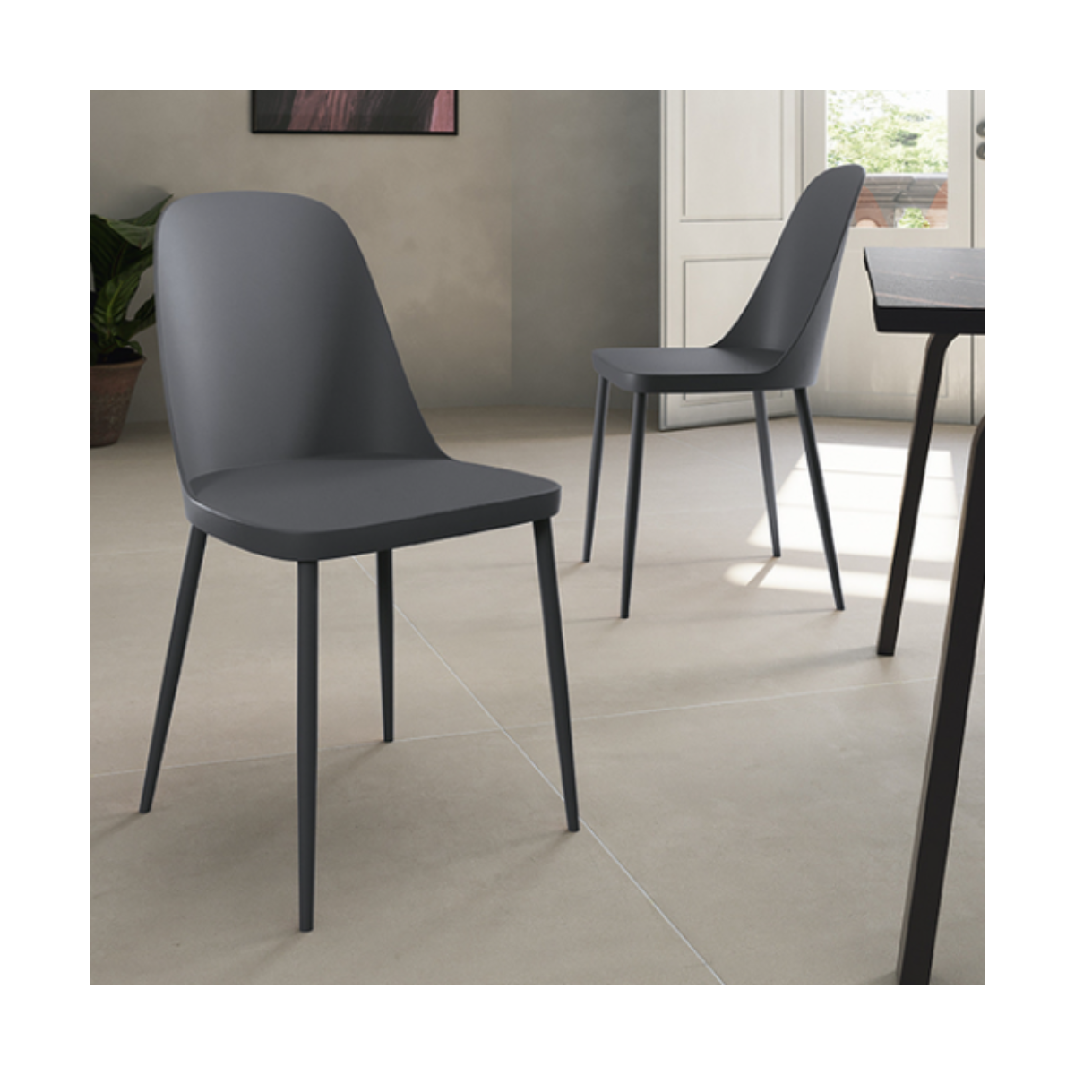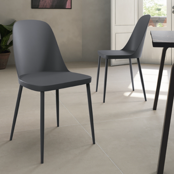 La struttura cambia in base al materiale scelto. Nelle versioni in tessuto e in soft touch, le gambe sono realizzate in metallo verniciato, resistenti e curate nei dettagli, perfette per un uso quotidiano e intensivo. Nella variante in polipropilene, invece, la struttura è interamente in tinta: seduta e gambe sono dello stesso materiale e colore, per un effetto monoblocco pulito e moderno.