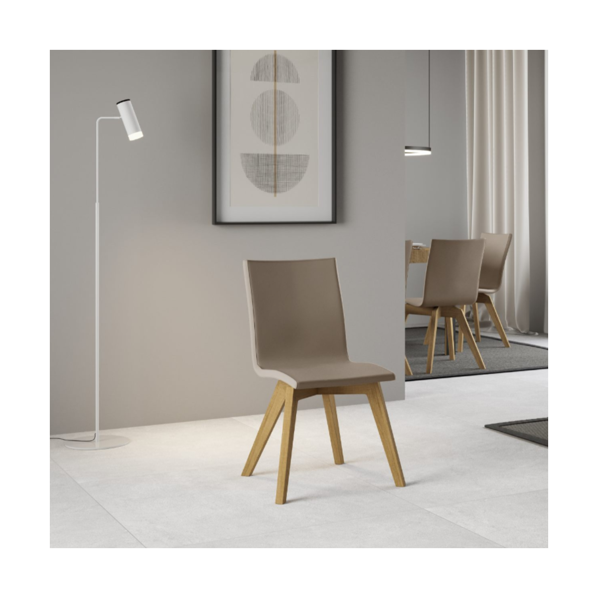 La seduta è realizzata con una solida scocca in legno rivestita in similpelle, leggermente imbottita per offrire il massimo comfort. Il rivestimento, disponibile nelle tonalità tortora, grigio e bianco, è morbido al tatto e resistente all’usura quotidiana. La praticità è uno dei suoi punti di forza, poiché la similpelle è estremamente facile da pulire con un semplice panno umido, rendendola perfetta per l’uso quotidiano in cucina, in sala da pranzo o in soggiorno.