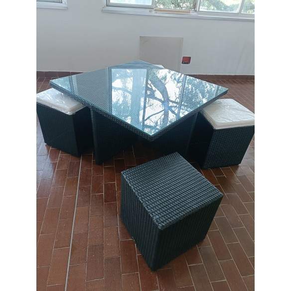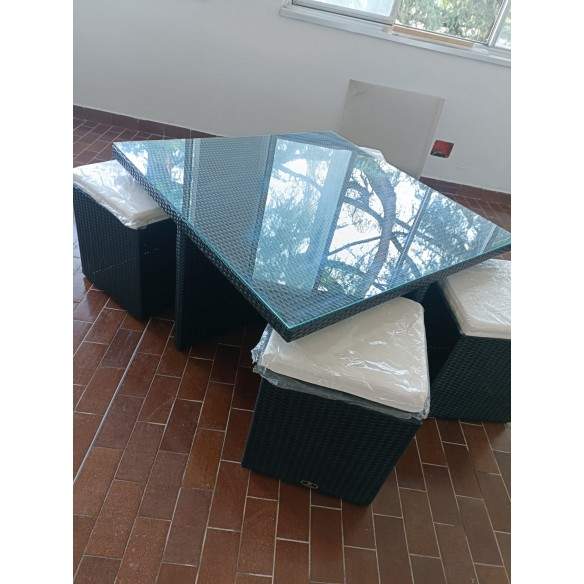OFFERTA SPECIALE PER SET COMPOSTO DA TAVOLINO + POUF IN RATTAN CON PIANO IN VETRO TEMPERATO APPOGGIATO