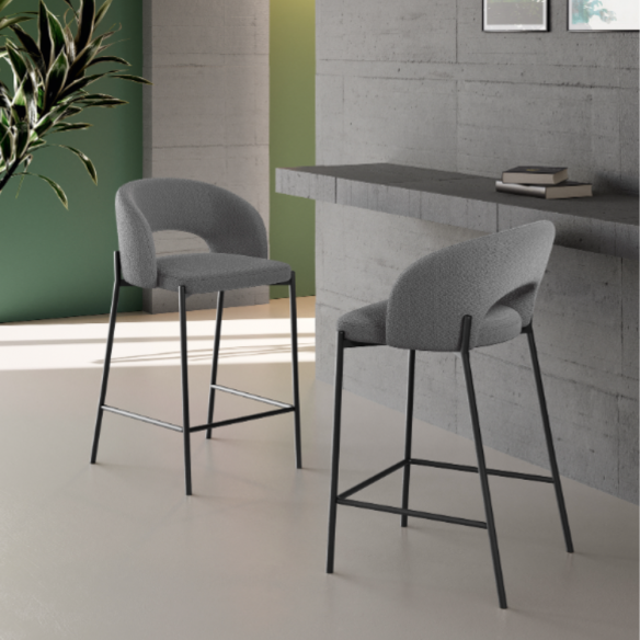 Lo sgabello GRETA è la perfetta fusione tra comfort avvolgente e stile deciso. La struttura in metallo verniciato nero dona solidità e carattere, mentre la seduta imbottita e rivestita in tessuto regala una piacevole sensazione di morbidezza sin dal primo utilizzo. Il suo punto di forza è lo schienale circolare, un dettaglio dal design distintivo che abbraccia la forma del corpo e offre un sostegno ergonomico e rilassante, ideale per accompagnare lunghe chiacchierate o momenti di convivialità.