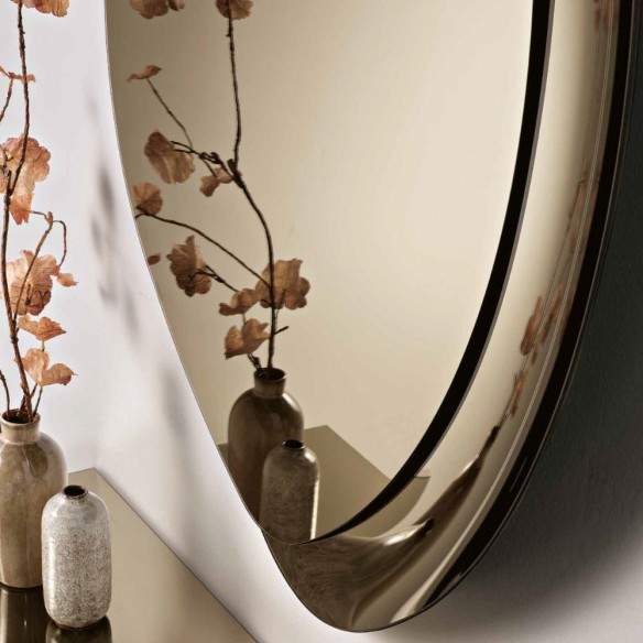 La sua forma sagomata, morbida e irregolare quanto basta, viene abbracciata da una semicornice in vetro fuso che cattura la luce e la rimanda in riflessi delicati, trasformando ogni ambiente in uno spazio più ampio, luminoso e ricercato. È uno di quegli elementi che entrano in una stanza e la completano, quasi come se fosse pensato proprio per quel muro.