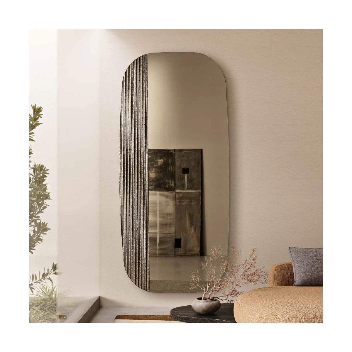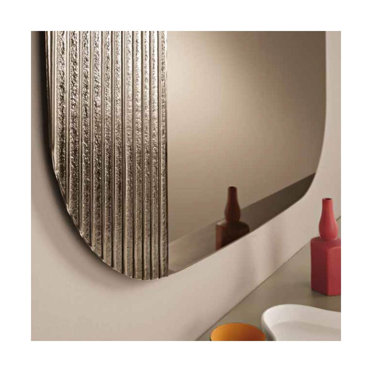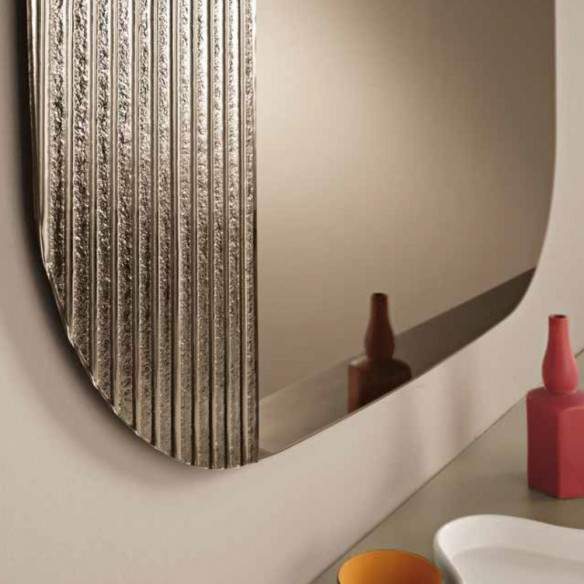 Lo specchio FUJI è un incontro perfetto tra forma e movimento: una superficie sagomata che si apre con linee morbide, impreziosita da un inserto in vetro mosso che crea riflessi dinamici e un carattere unico.