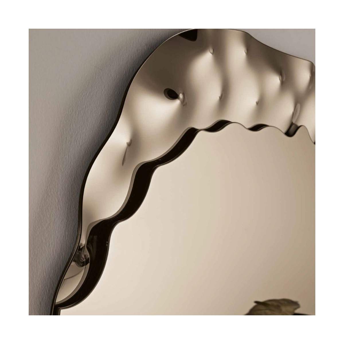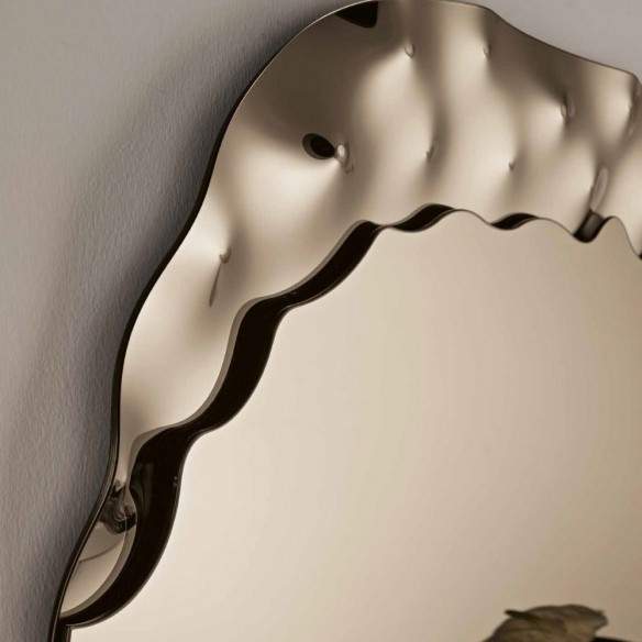 Lo specchio FUJI è un incontro perfetto tra forma e movimento: una superficie sagomata che si apre con linee morbide, impreziosita da un inserto in vetro mosso che crea riflessi dinamici e un carattere unico.
