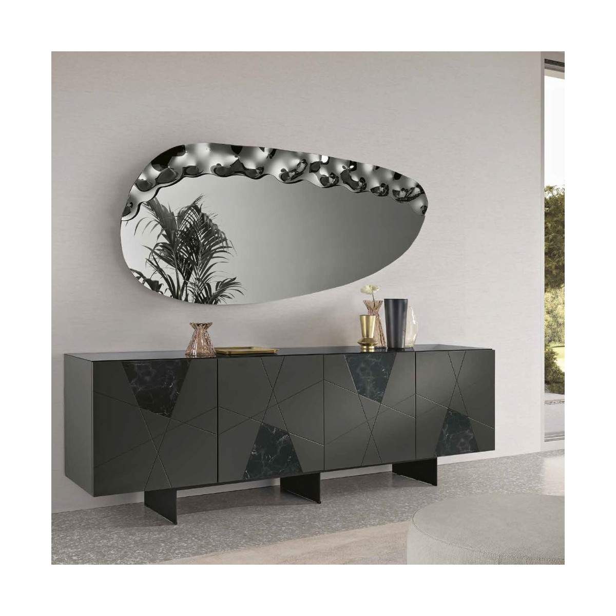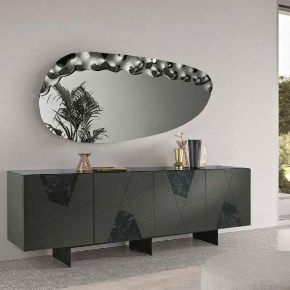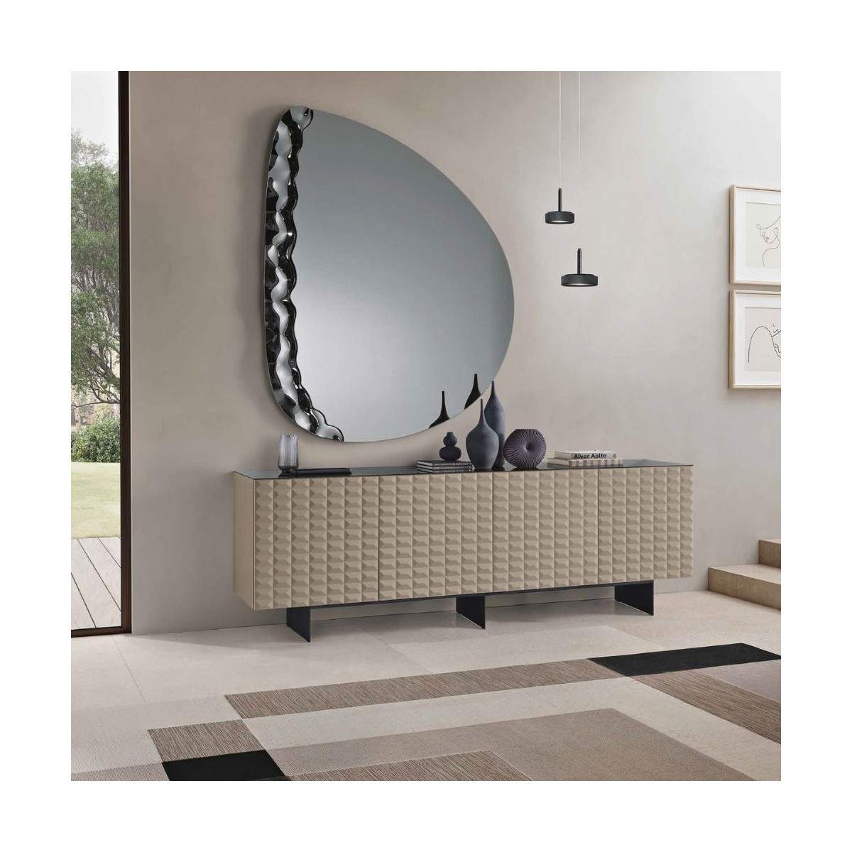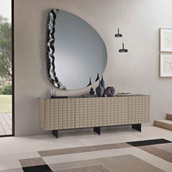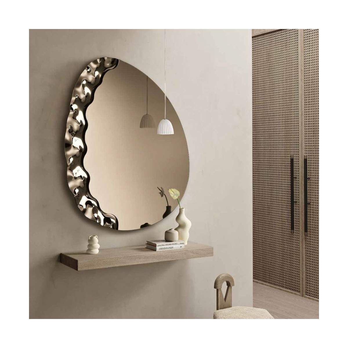 Lo specchio FUJI è un incontro perfetto tra forma e movimento: una superficie sagomata che si apre con linee morbide, impreziosita da un inserto in vetro mosso che crea riflessi dinamici e un carattere unico.