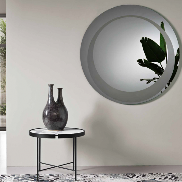 Questo specchio tondo è adornato con una decorazione sabbiata, disponibile in vari colori per soddisfare i gusti più raffinati. Con diametri di Ø 90 cm e Ø 120 cm, si adatta splendidamente a diversi ambienti, conferendo luminosità e profondità con un tocco di stile distintivo.