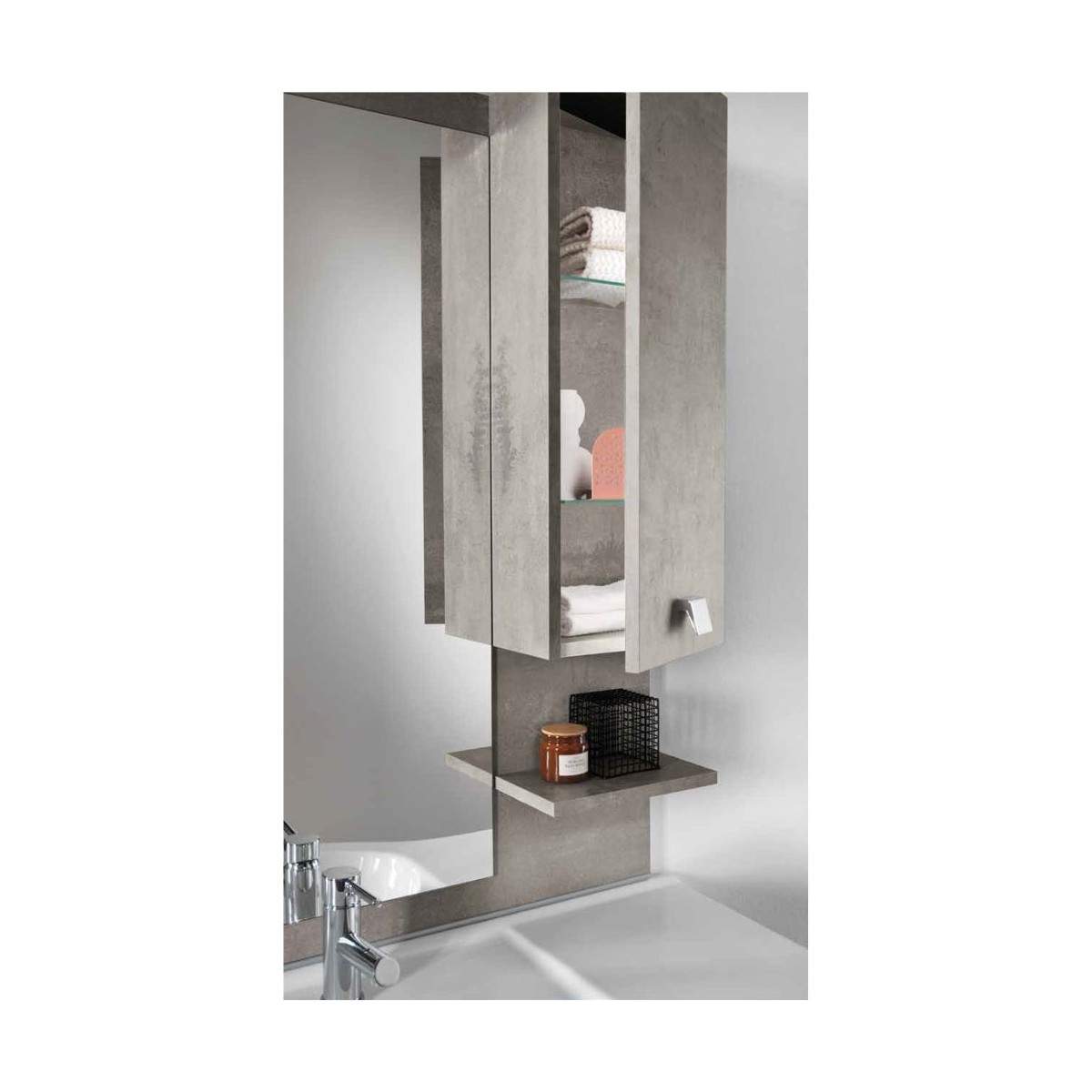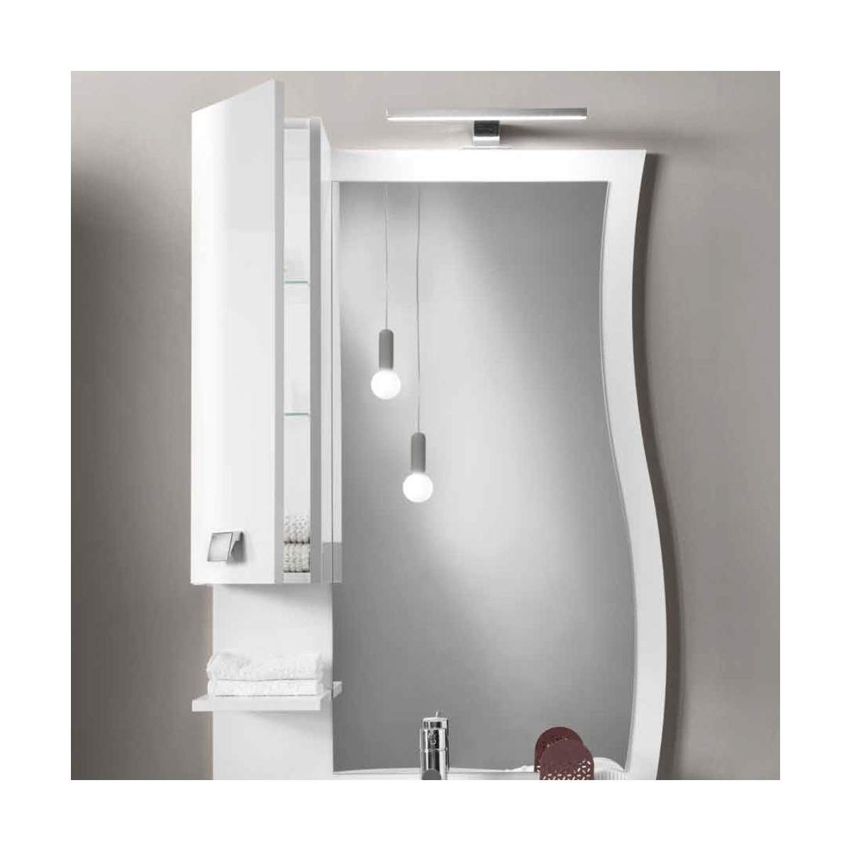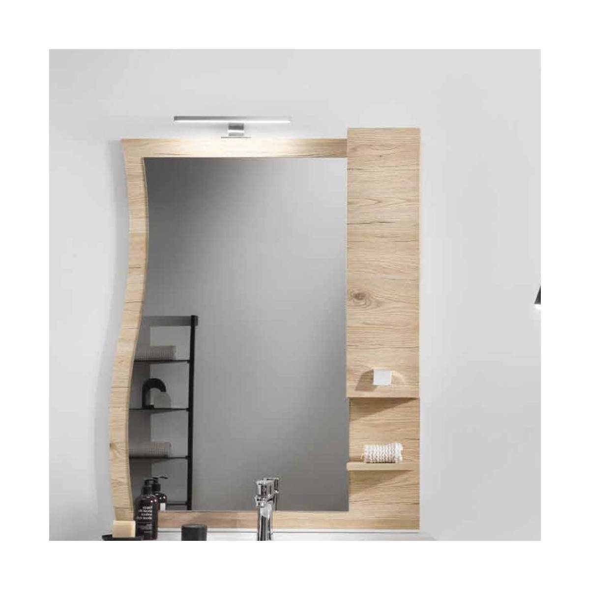 Disponibile in diverse misure (70, 80 e 100 cm) e in vari colori eleganti: Bianco lucido, Bianco nordico, Quercia naturale e Cemento chiaro, lo specchio ONDA si integra perfettamente in qualsiasi ambiente bagno, offrendo praticità senza rinunciare allo stile.
