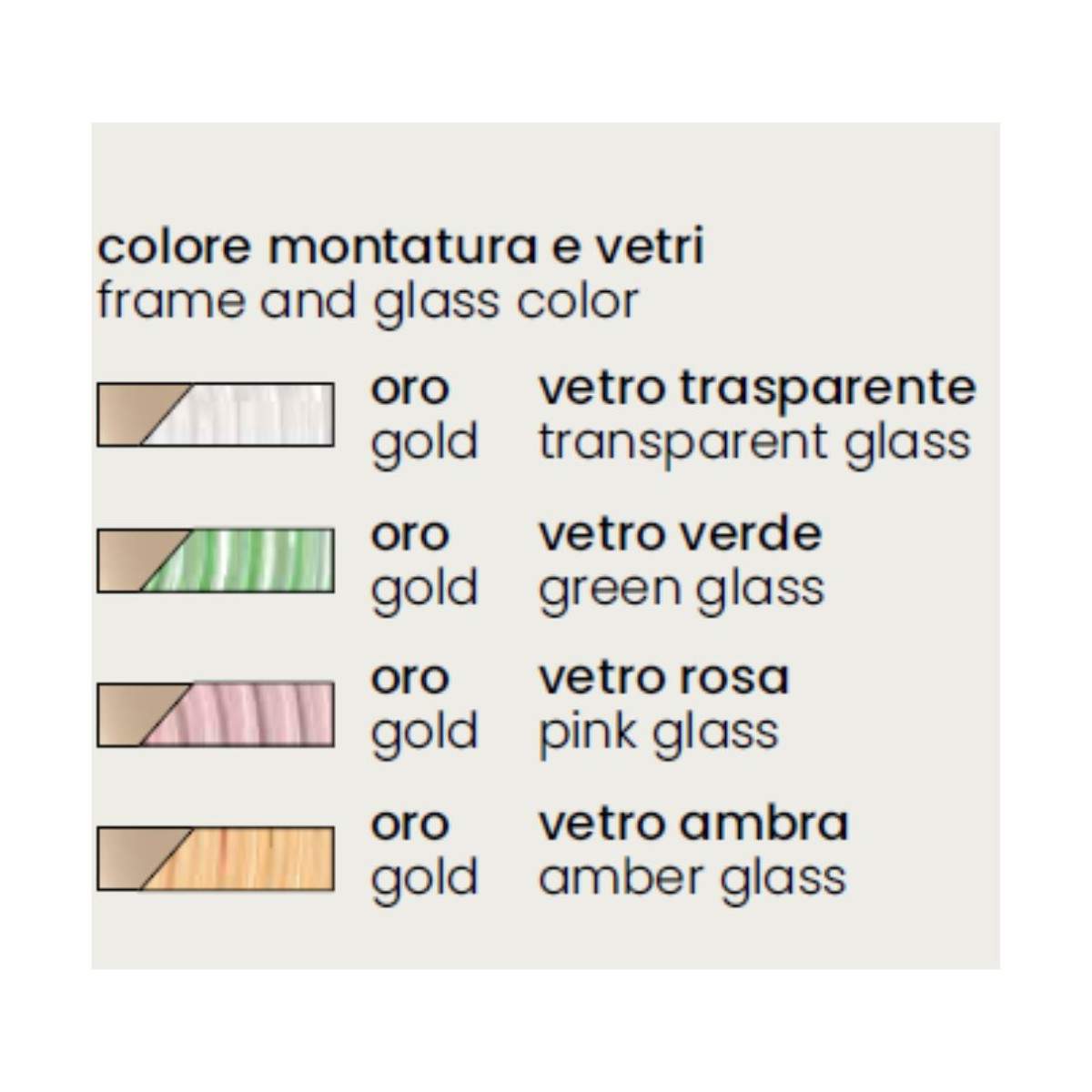 Il vetro è disponibile in quattro tonalità esclusive, perfette per dare personalità a ogni spazio: trasparente, verde, rosa, ambra – tutte abbinate alla struttura in oro per un risultato armonico e sofisticato.
