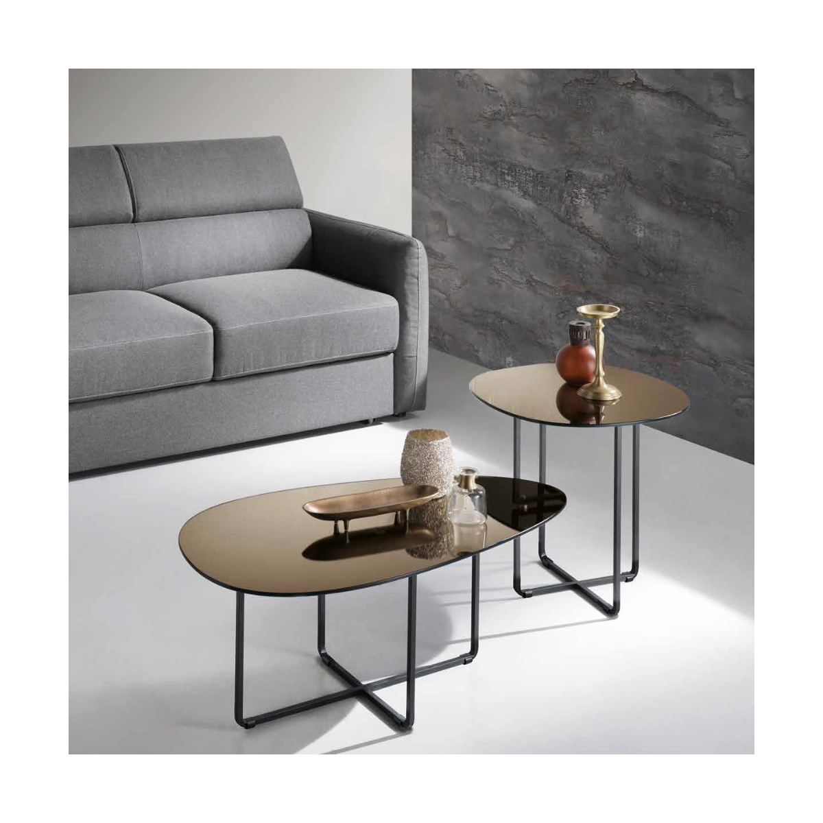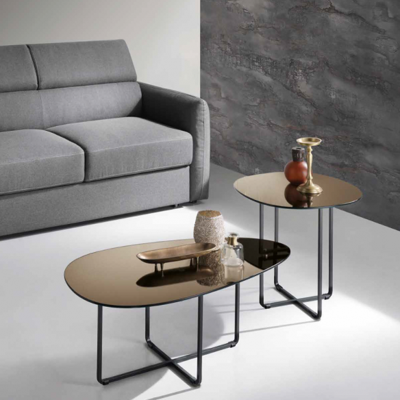 Tavolino in metallo disponibile nelle versioni in vetro effetto specchio o ceramica effetto marmo stratificata su vetro.