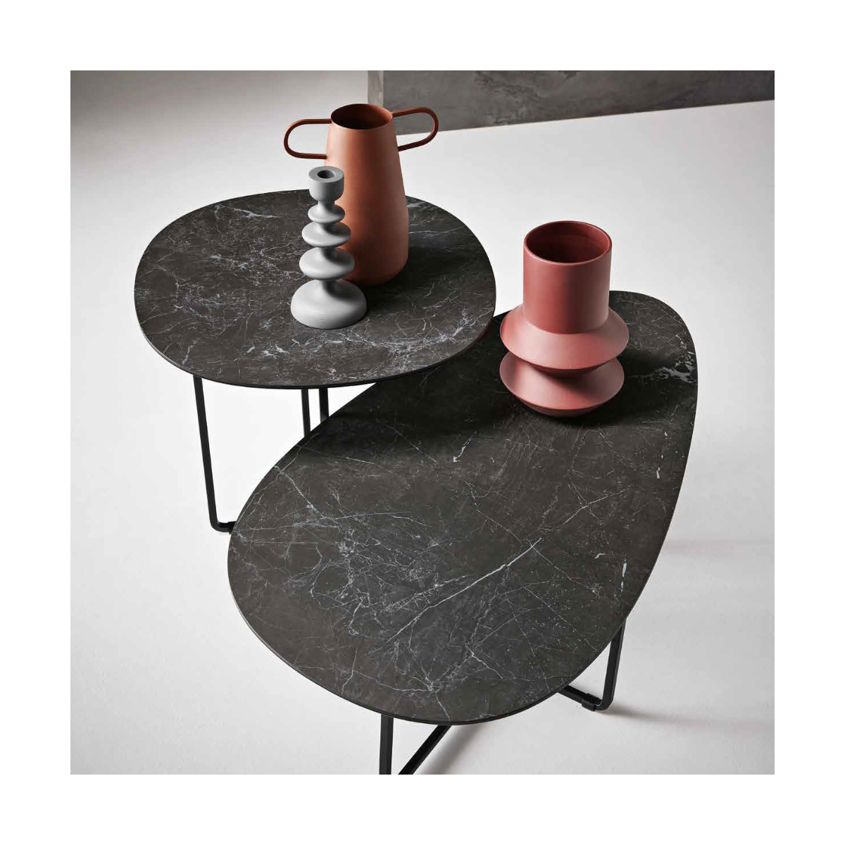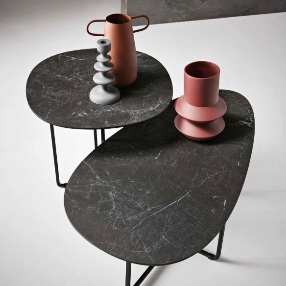 Tavolino in metallo disponibile nelle versioni in vetro effetto specchio o ceramica effetto marmo stratificata su vetro.