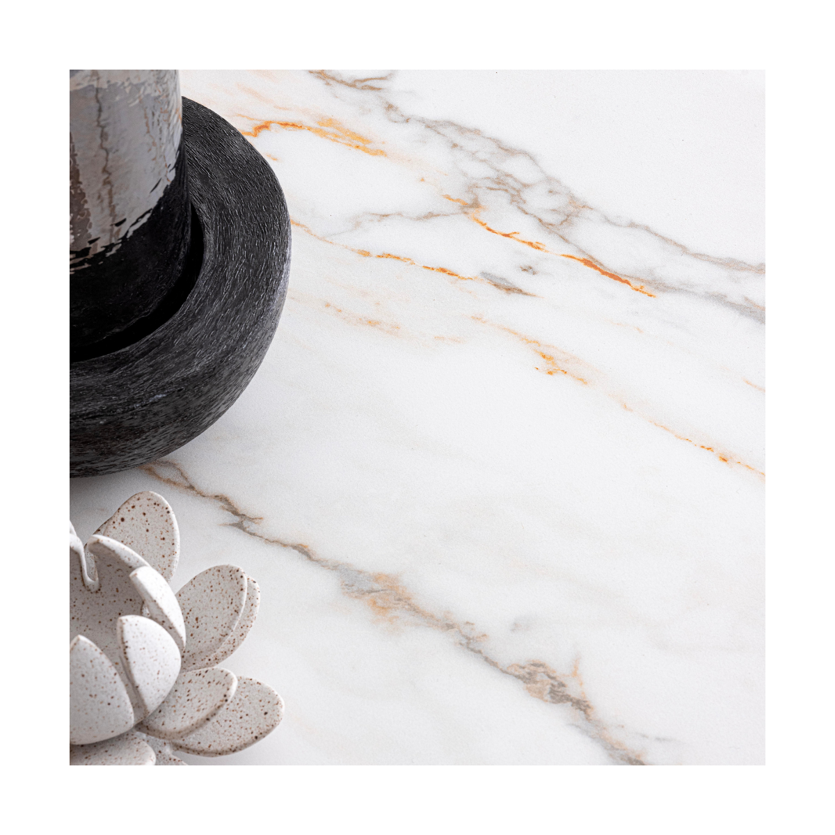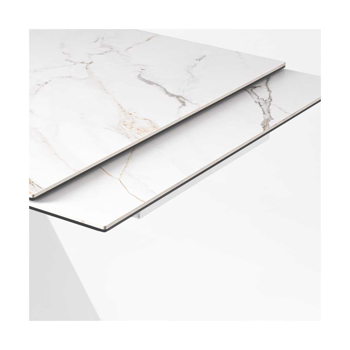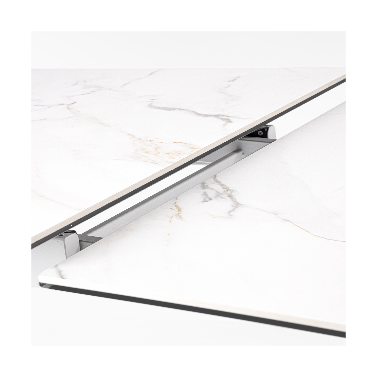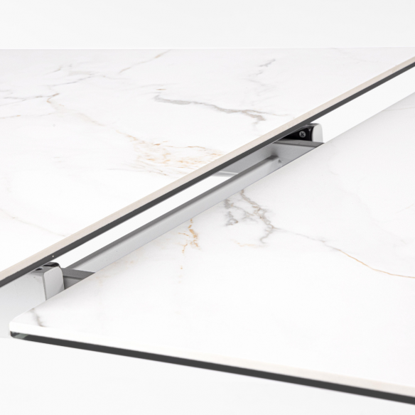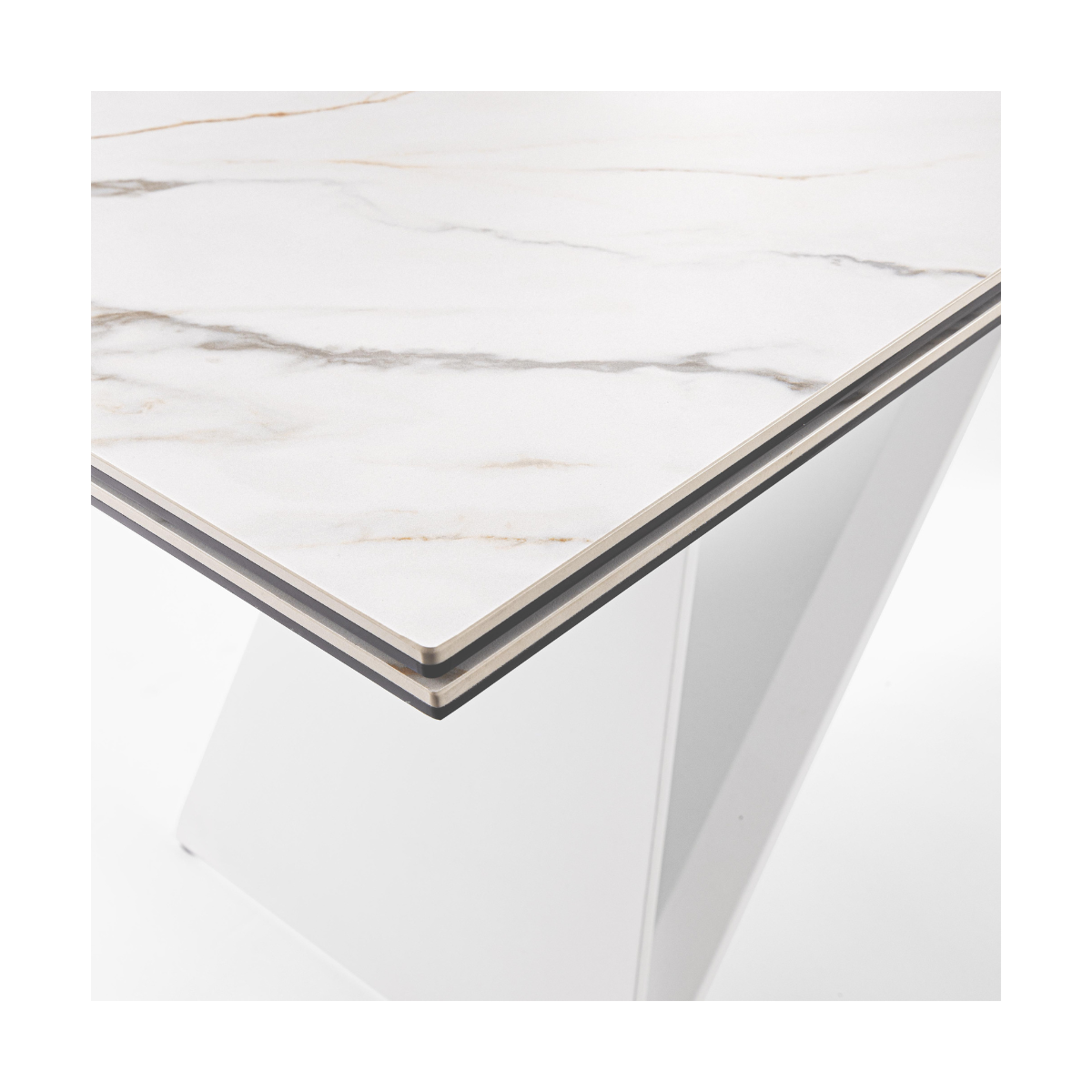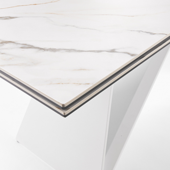 Le gambe e la base sono realizzate in acciaio verniciato a polvere, materiale resistente e stabile che assicura robustezza e durabilità nel tempo. Il piano, composto da un raffinato strato di ceramica accoppiato a vetro temperato, è pratico, resistente al calore, ai graffi e facilissimo da pulire. L’effetto visivo è sobrio e contemporaneo, perfetto per ambienti moderni e curati.