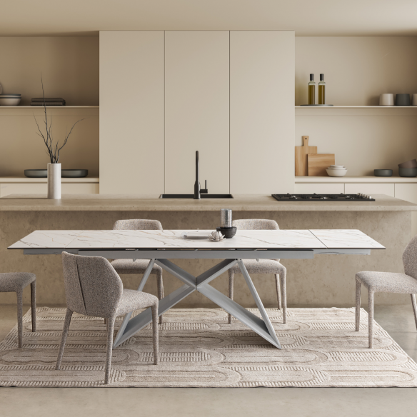 Il meccanismo di estensione è discreto e semplice da utilizzare, ideale per cene con amici o pranzi in famiglia. Una volta chiuso, il tavolo mantiene linee pulite e un ingombro contenuto; da aperto, diventa il protagonista della sala da pranzo.