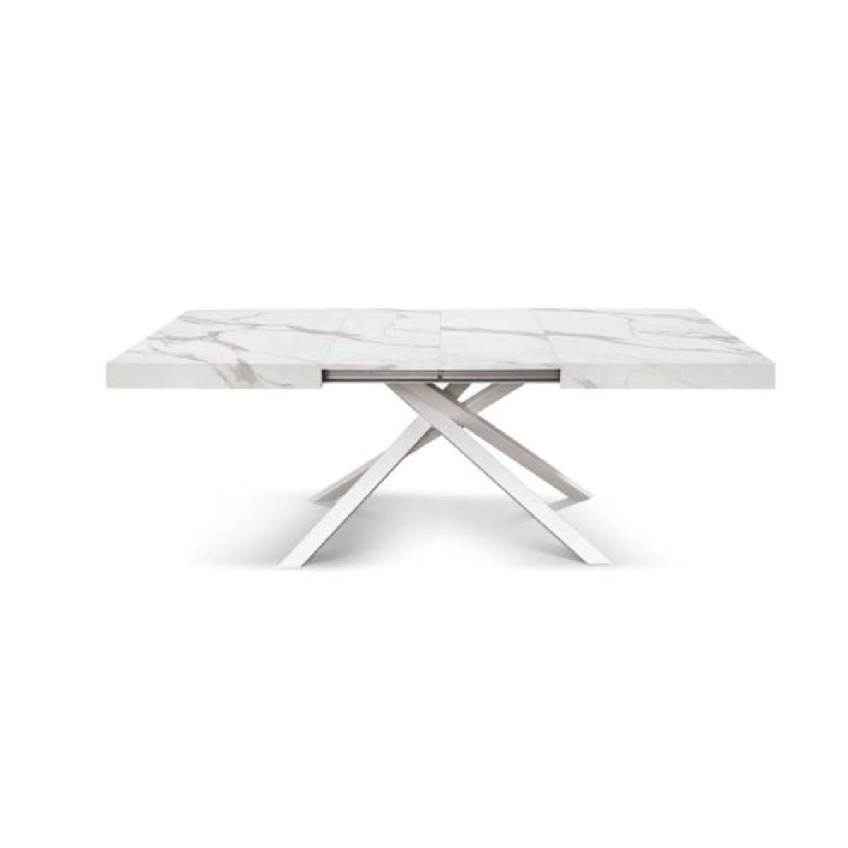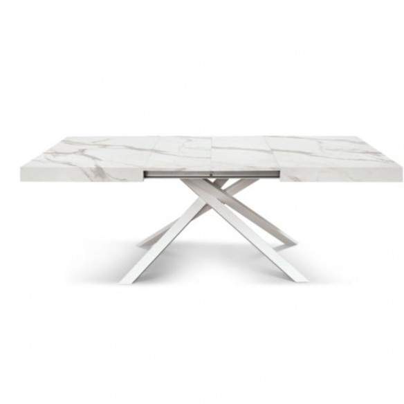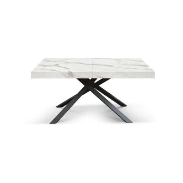 Tavolo allungabile CAPRI con base in metallo colore nero o bianco, piano in nobilitato finitura marmo bianco statuario con 2 allunghe da 40 cm
