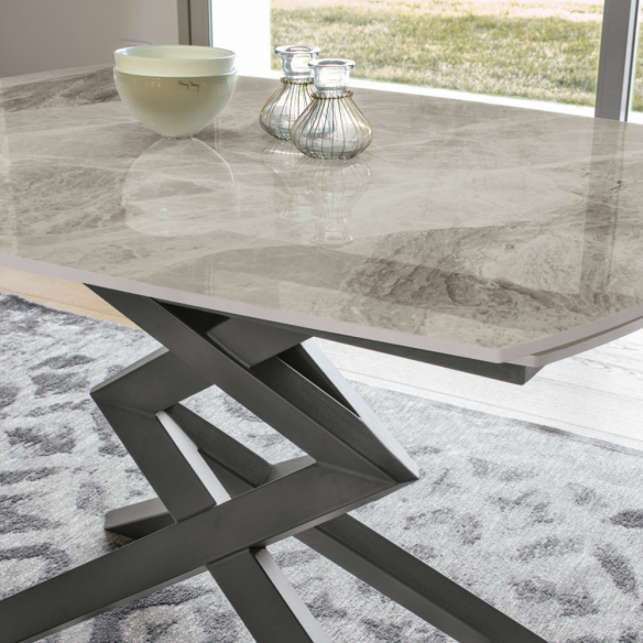 Tavolo allungabile CROSS 160 con piano rettangolare in gres lucido o opaco e struttura in metallo.