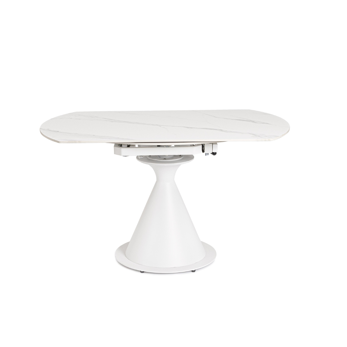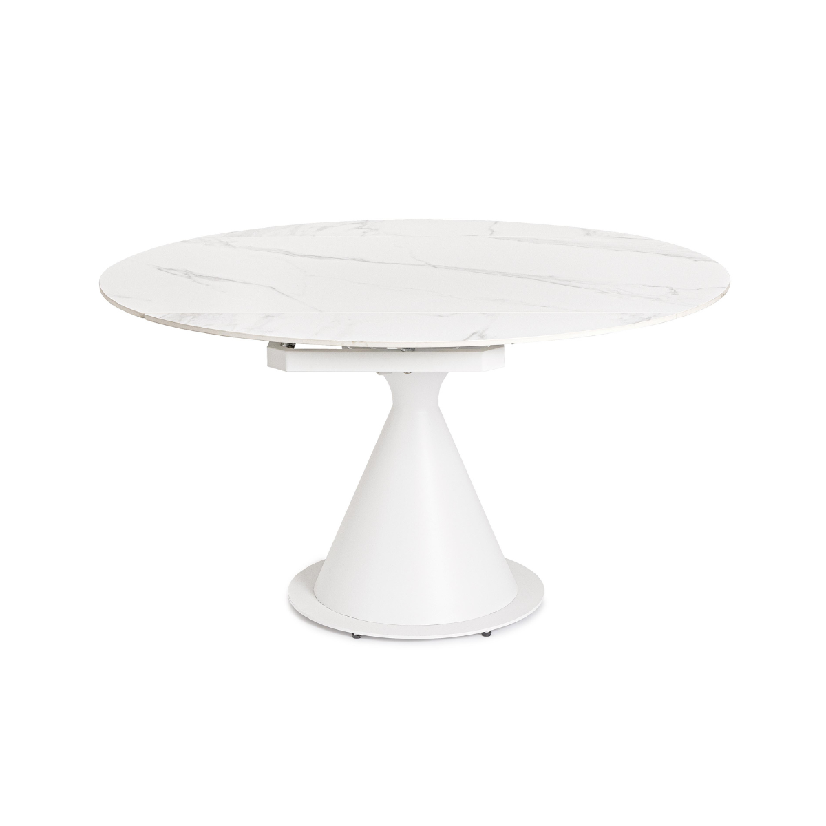 Dalla forma rotonda e allungabile, il tavolo passa da un diametro di 85 cm a 130 cm, grazie a un pratico sistema di estensione, mantenendo un’eccellente stabilità e armonia nelle proporzioni.