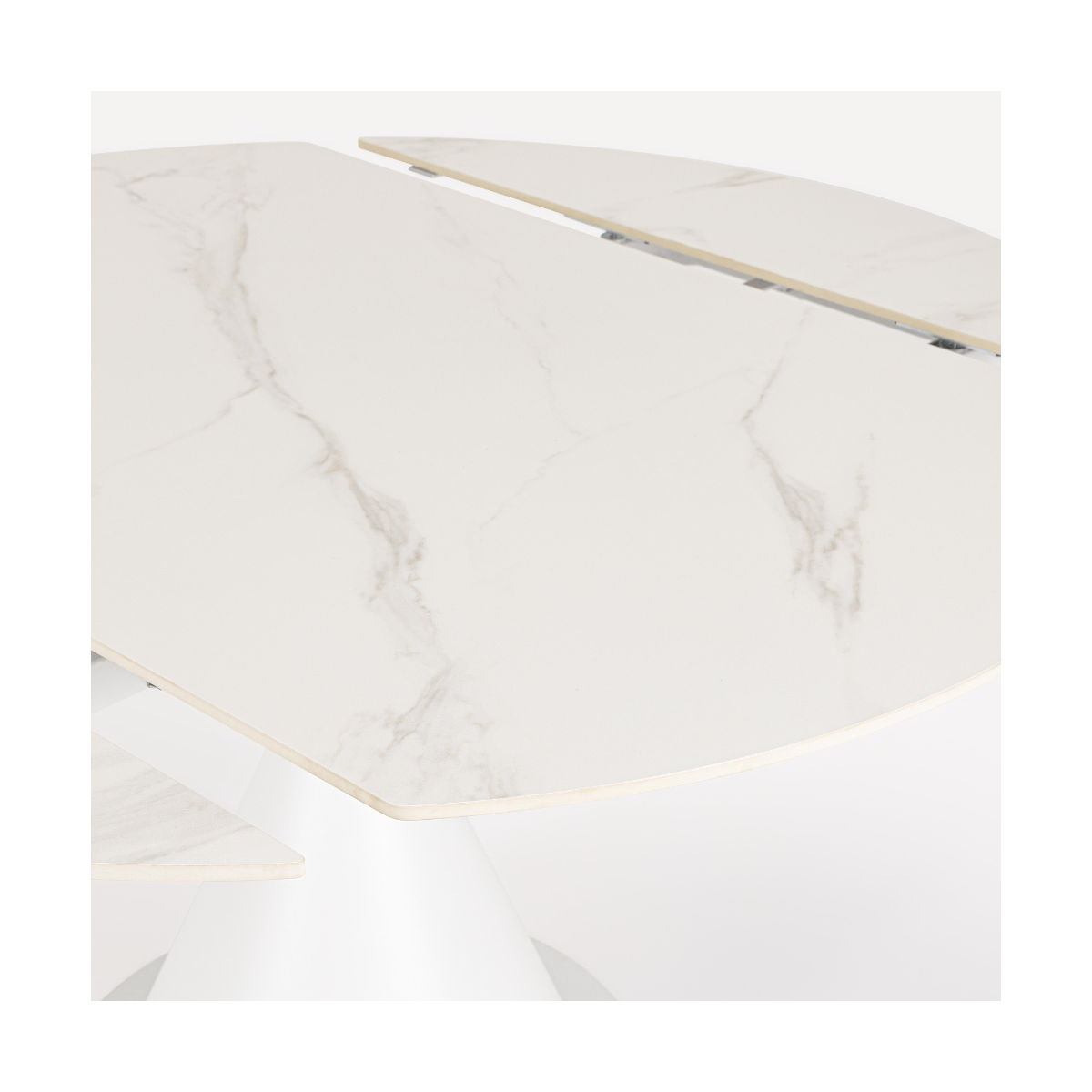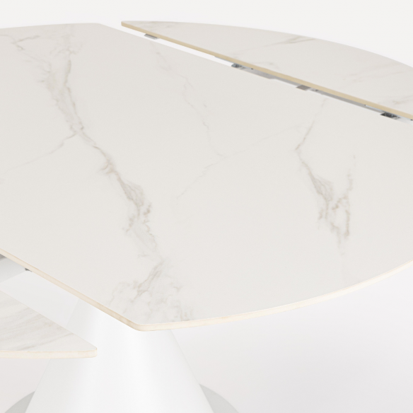 La struttura in acciaio verniciato a polvere epossidica, nel colore bianco, garantisce solidità e resistenza nel tempo, mentre il piano in gres porcellanato con effetto marmo bianco conferisce raffinatezza ed è estremamente durevole, resistente a graffi, calore e macchie. Il risultato è un tavolo elegante ma anche pratico, pensato per l’uso quotidiano.