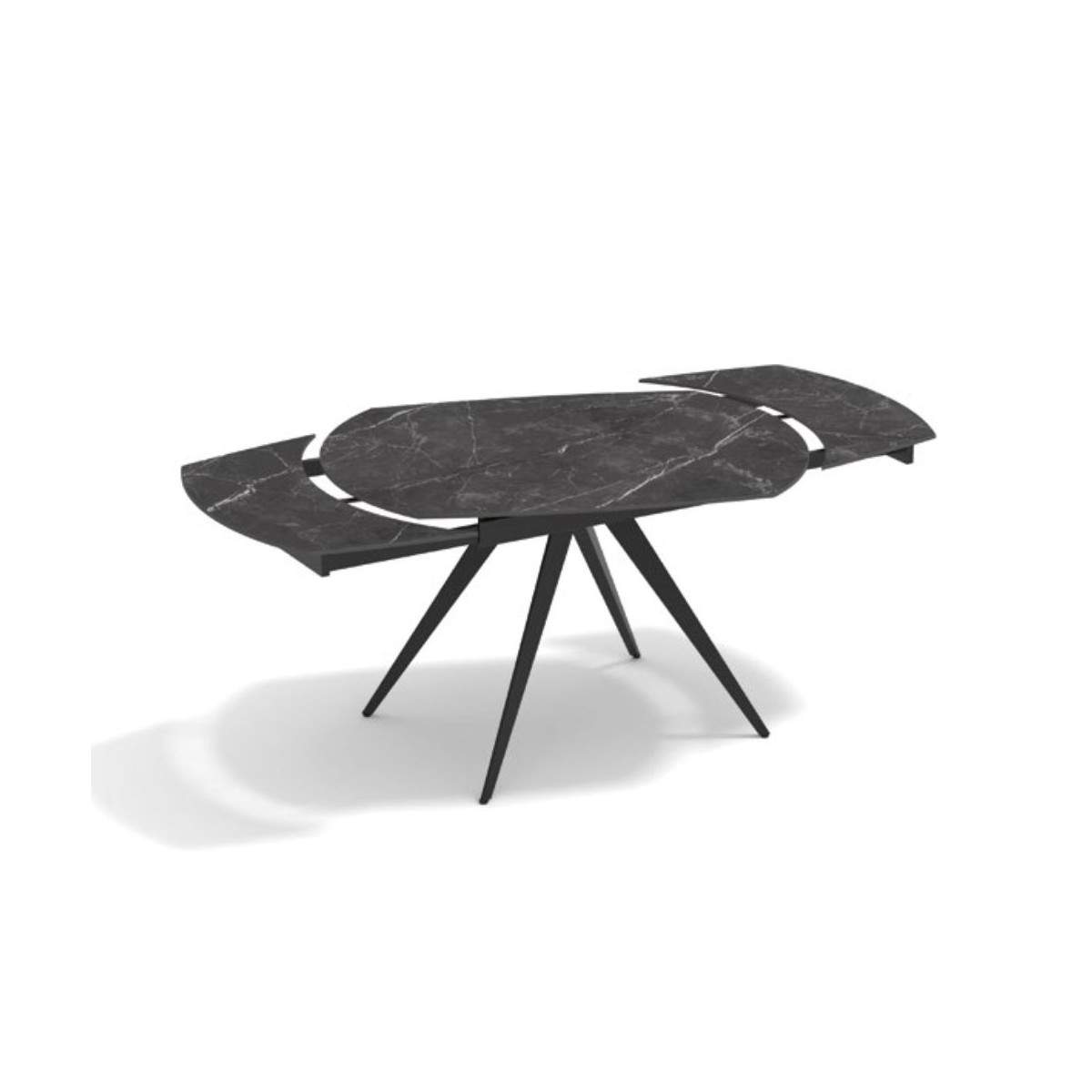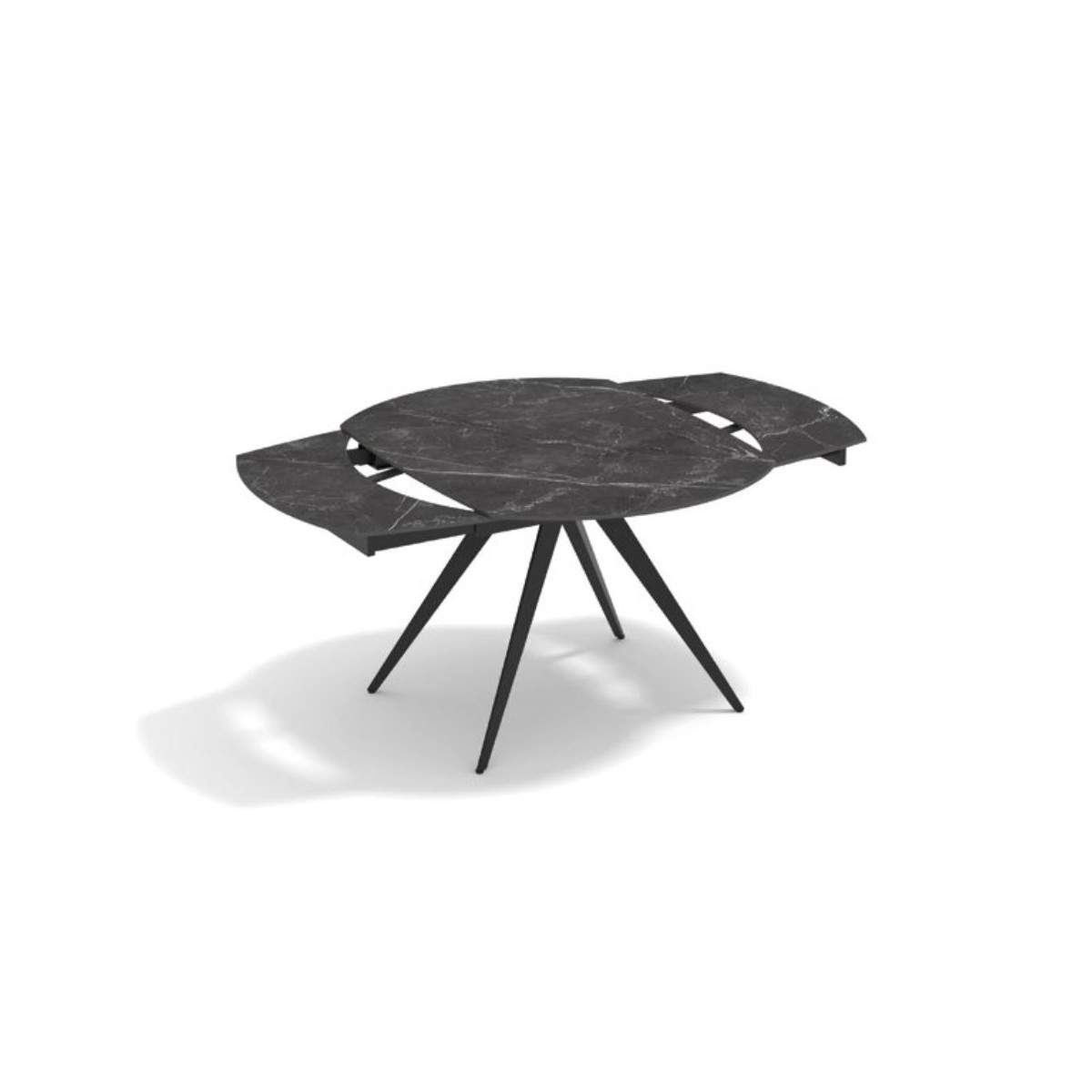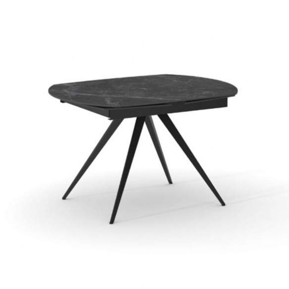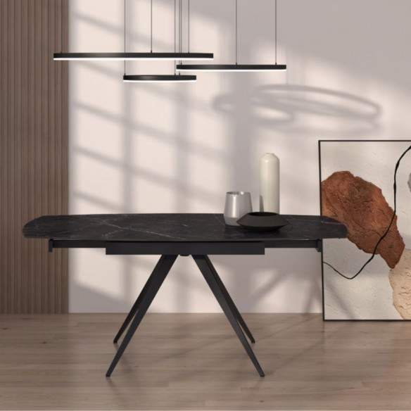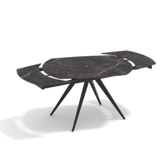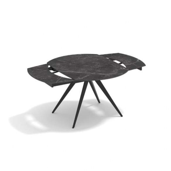 Tavolo allungabile LUNA rotante con base in metallo colore nero, pino opaco arrotondato in ceramica finiture marmo nero con 2 allunghe da 30 cm