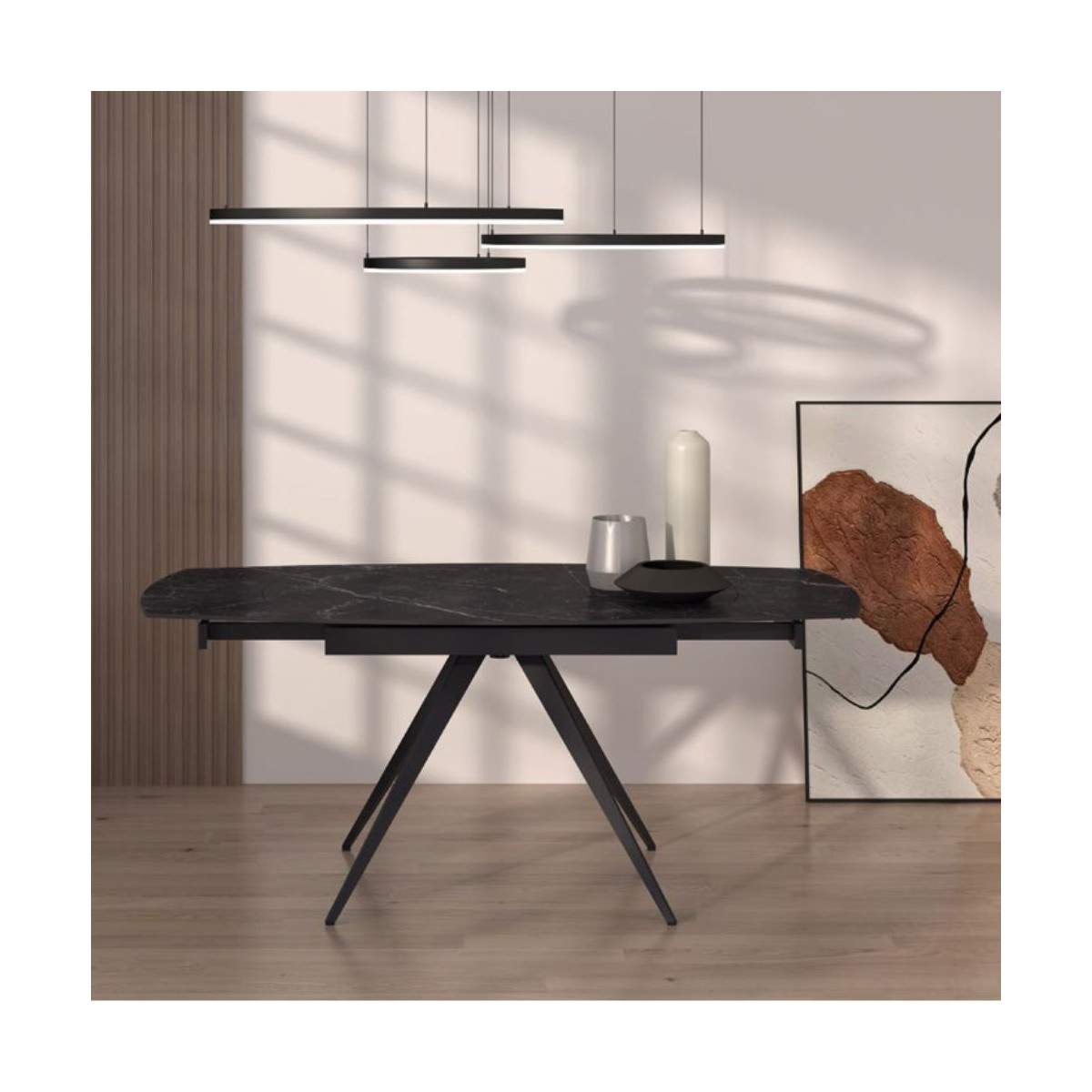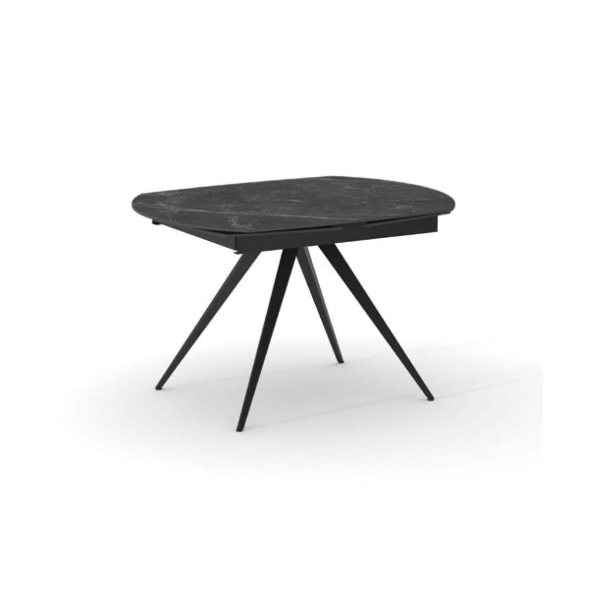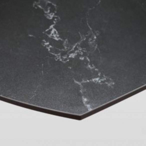 Tavolo allungabile LUNA rotante con base in metallo colore nero, pino opaco arrotondato in ceramica finiture marmo nero con 2 allunghe da 30 cm