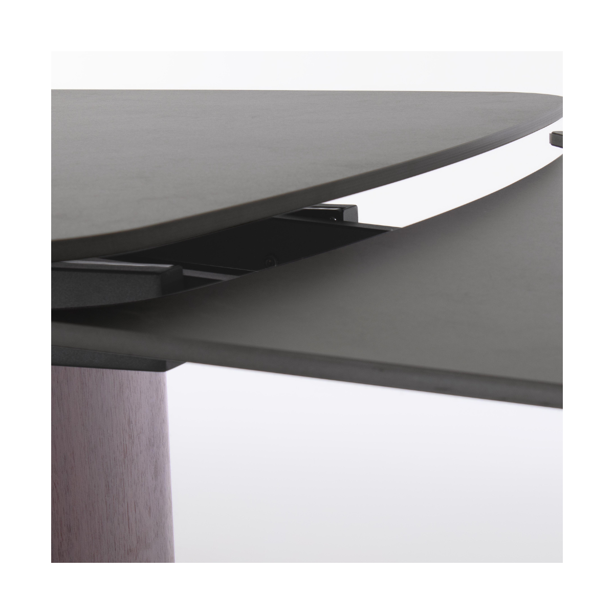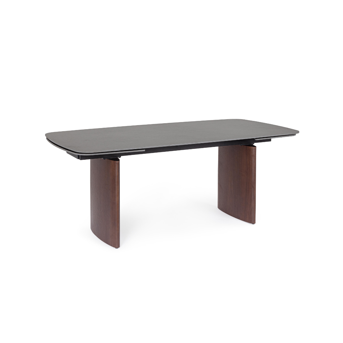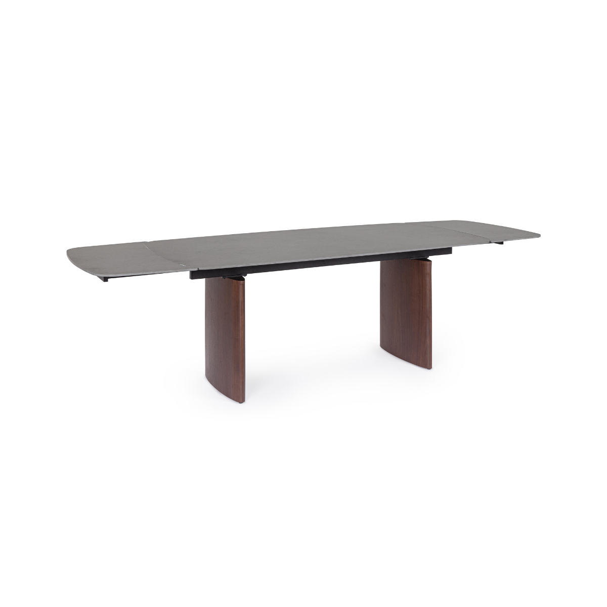 La struttura in MDF impiallacciato legno di noce, unita al supporto in acciaio verniciato a polvere epossidica, assicura solidità e un tocco di pregio artigianale. Le prolunghe indipendenti permettono di estendere il tavolo fino a 260 cm, rendendolo ideale per ospitare da 6 a 10 persone.