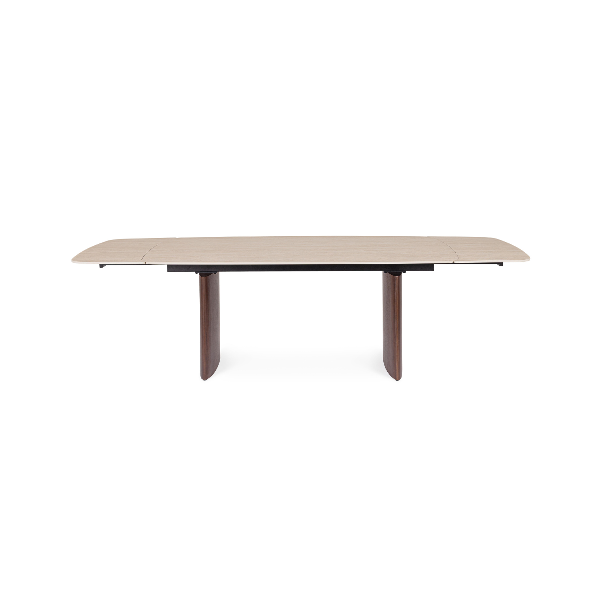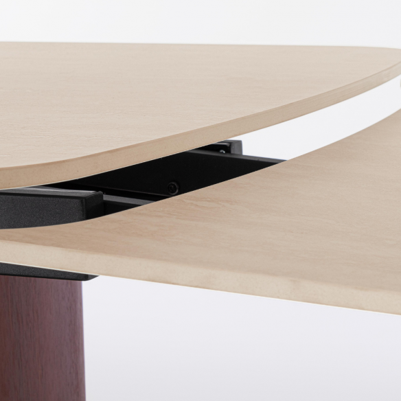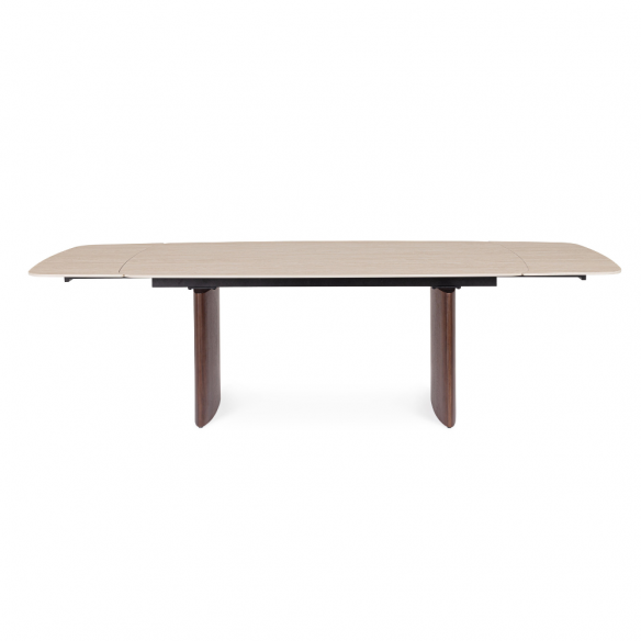La struttura in MDF impiallacciato legno di noce, unita al supporto in acciaio verniciato a polvere epossidica, assicura solidità e un tocco di pregio artigianale. Le prolunghe indipendenti permettono di estendere il tavolo fino a 260 cm, rendendolo ideale per ospitare da 6 a 10 persone.