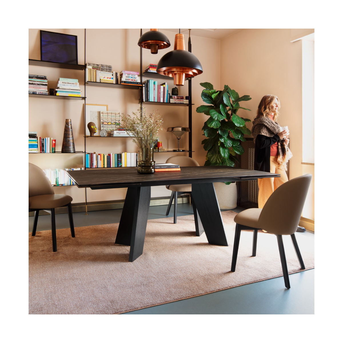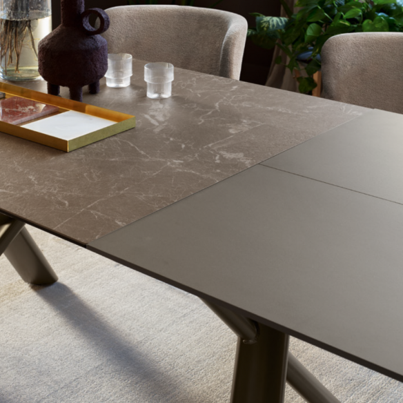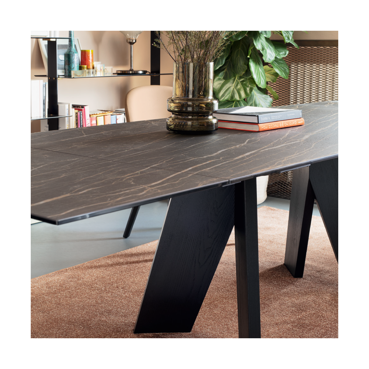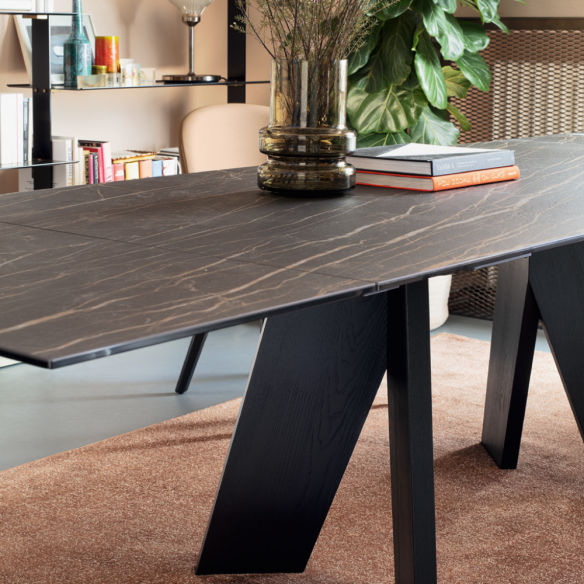 Il tavolo si distingue per il basamento e il cassonetto in frassino e metallo, che uniscono solidità e calore naturale. Il piano e le allunghe in ceramica donano un tocco di prestigio, oltre a garantire resistenza a graffi, calore e macchie, rendendo questo tavolo perfetto per un uso quotidiano senza pensieri.