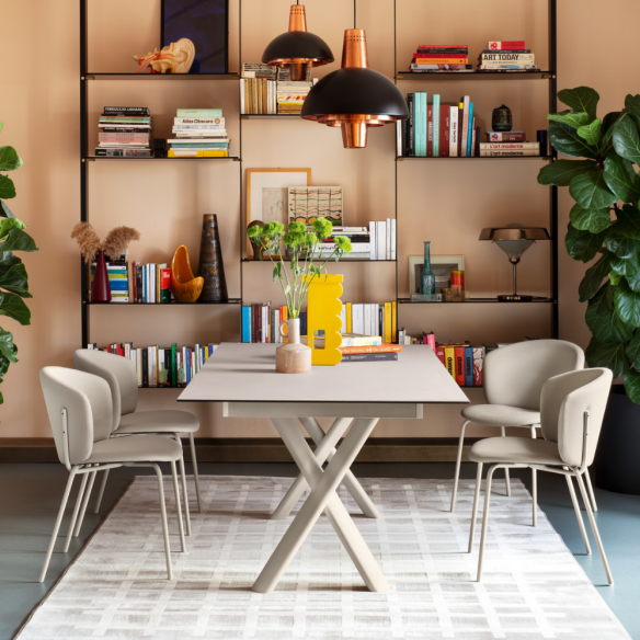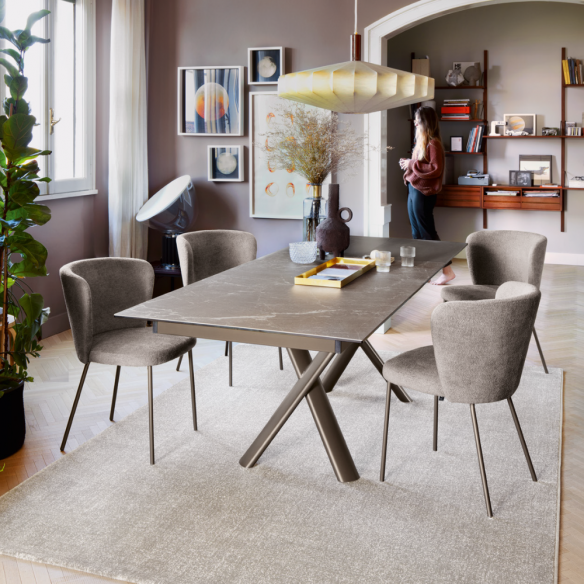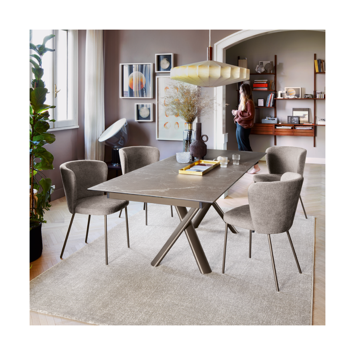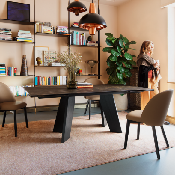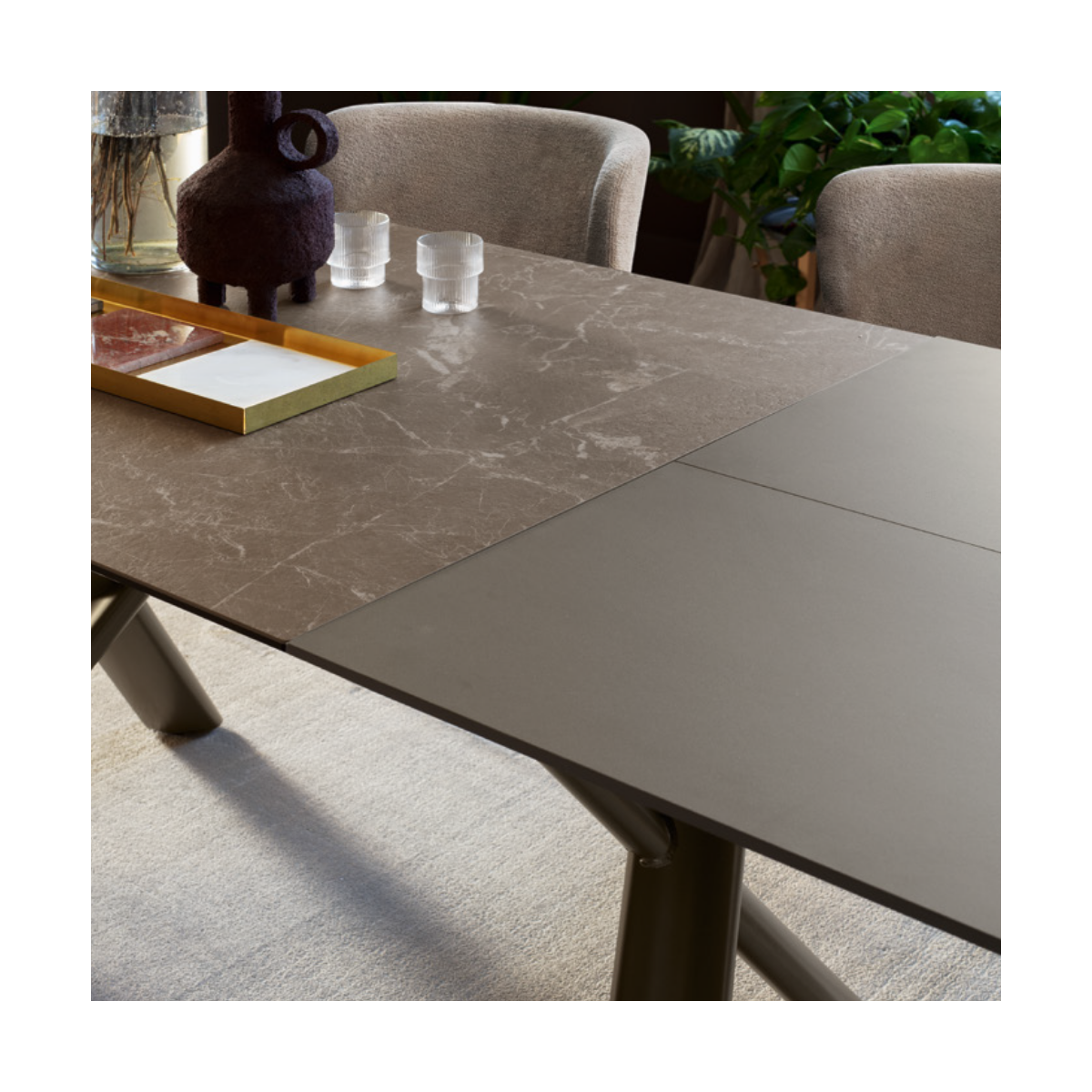 Il tavolo si distingue per il basamento e il cassonetto in frassino e metallo, che uniscono solidità e calore naturale. Il piano e le allunghe in ceramica donano un tocco di prestigio, oltre a garantire resistenza a graffi, calore e macchie, rendendo questo tavolo perfetto per un uso quotidiano senza pensieri.