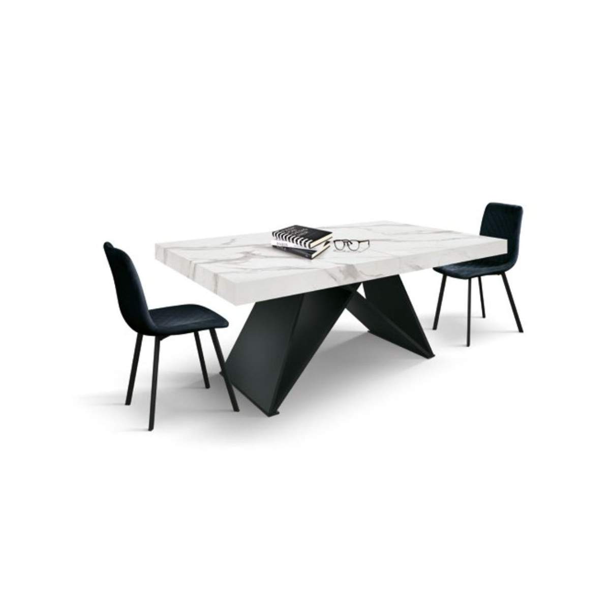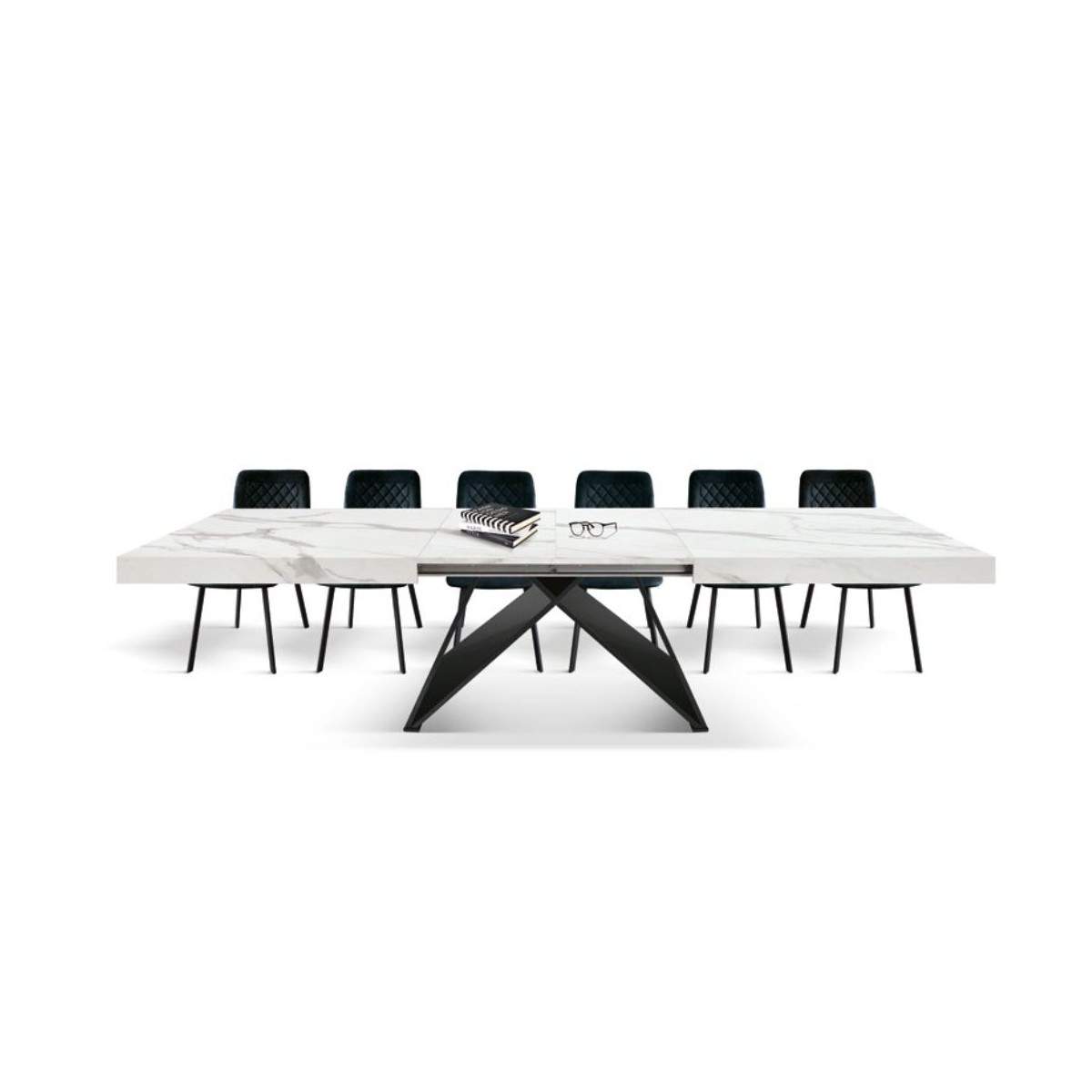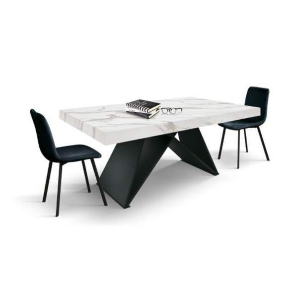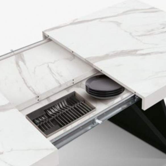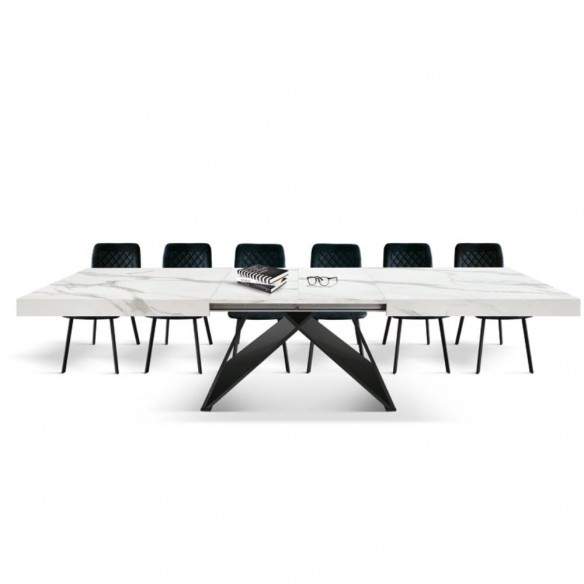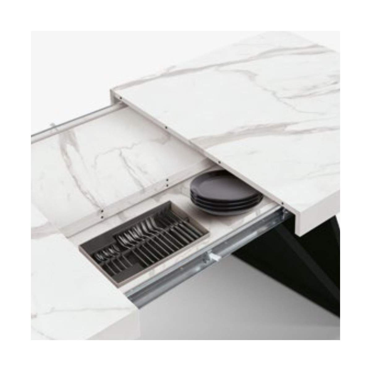 Tavolo allungabile MILANO con base in MDF rivestita colore nero, piano in nobilitato finitura marmo bianco statuario con 2 allunghe da 40 cm