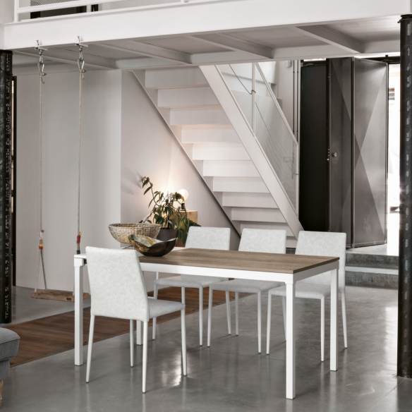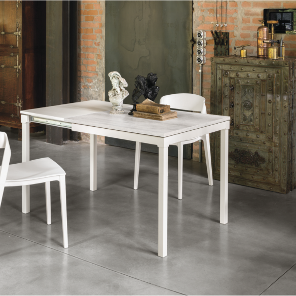 Tavolo allungabile PERIGEO con struttura in metallo e piano in gres o laminato effetto legno.