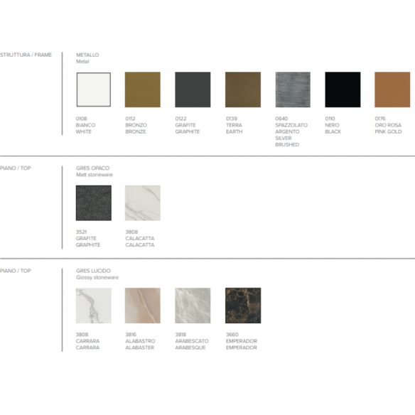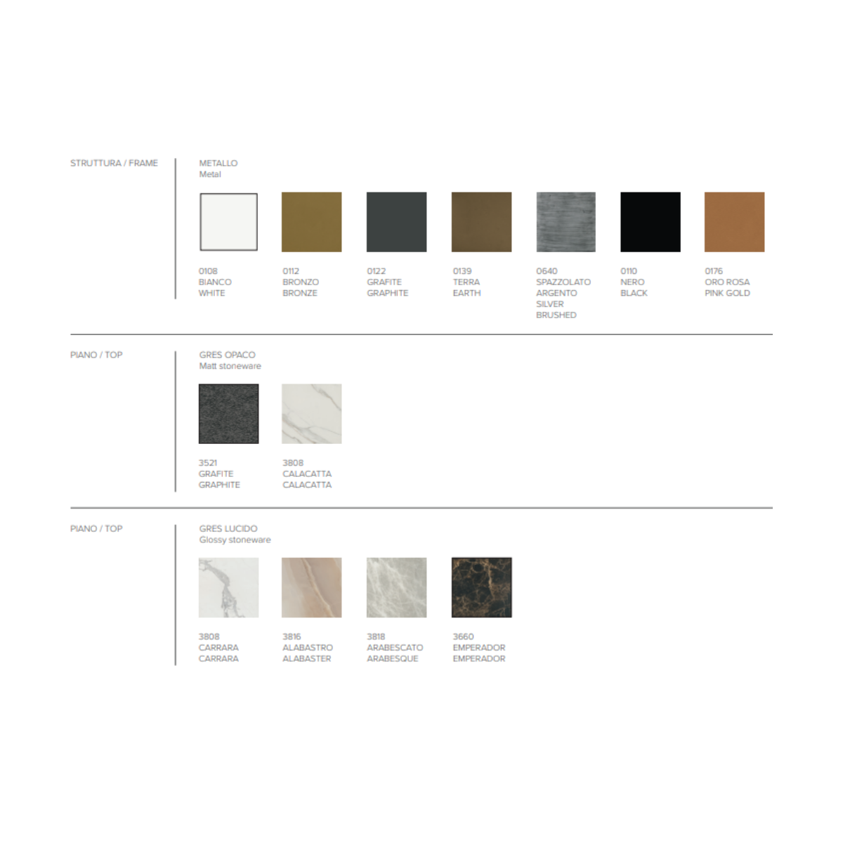 Il piano, realizzato in gres di altissima qualità, può essere scelto nella versione opaca o lucida, offrendo una versatilità estetica che soddisfa i gusti più esigenti. Le finiture disponibili esaltano ulteriormente l'unicità del prodotto, permettendo di personalizzare il tavolo per armonizzarsi perfettamente con l’arredo circostante.