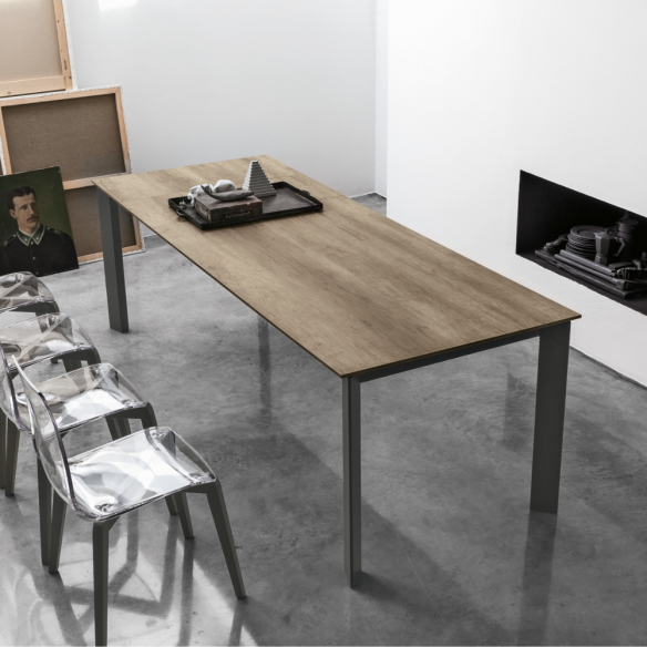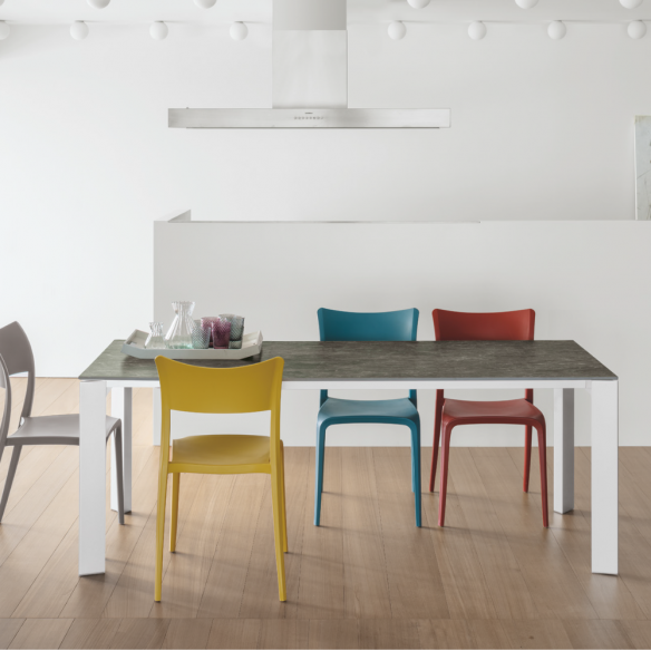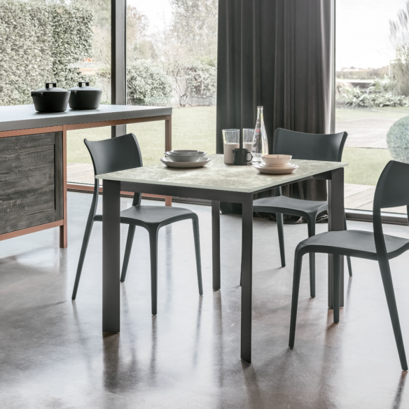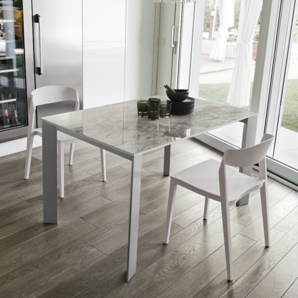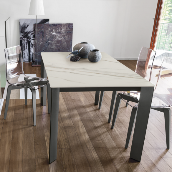 Tavolo allungabile SATURNO con struttura in metallo e piano disponibile in : gres, vetro ondulato laminato.
