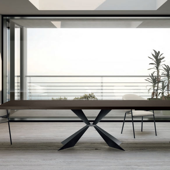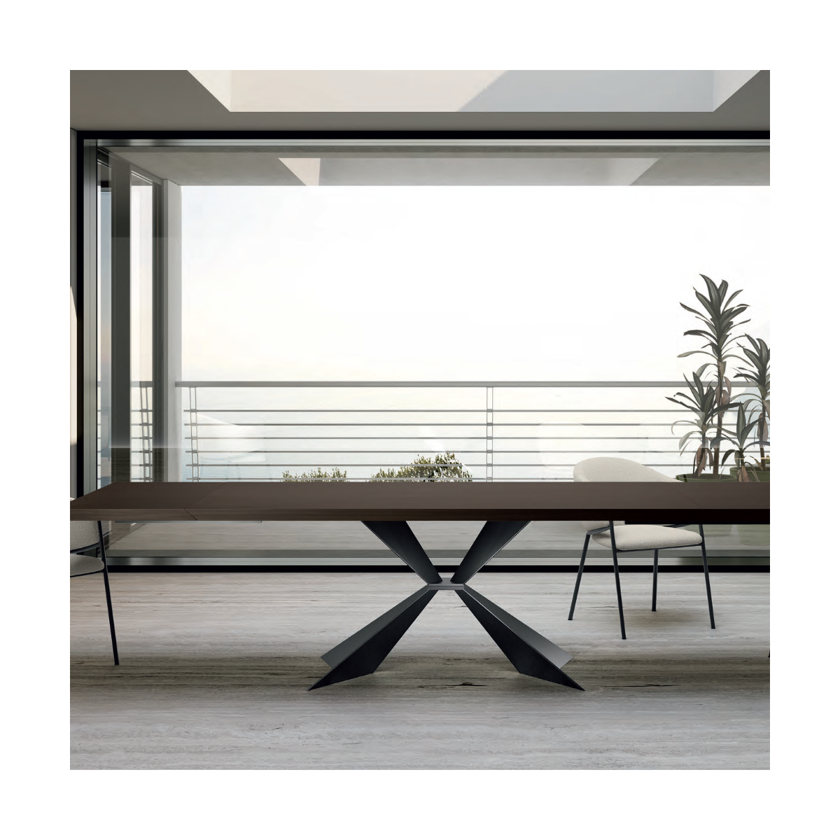 Il tavolo allungabile STARK di Stones è la sintesi perfetta tra un design innovativo e una funzionalità pratica e versatile. La sua struttura in metallo verniciato nero si distingue per una forma che ricorda un fiocco o una farfalla stilizzata, un dettaglio elegante che dona movimento e leggerezza al tavolo. La base scultorea non solo supporta con solidità il piano, ma diventa un elemento decorativo che trasforma ogni ambiente, portando un tocco di raffinatezza e originalità.