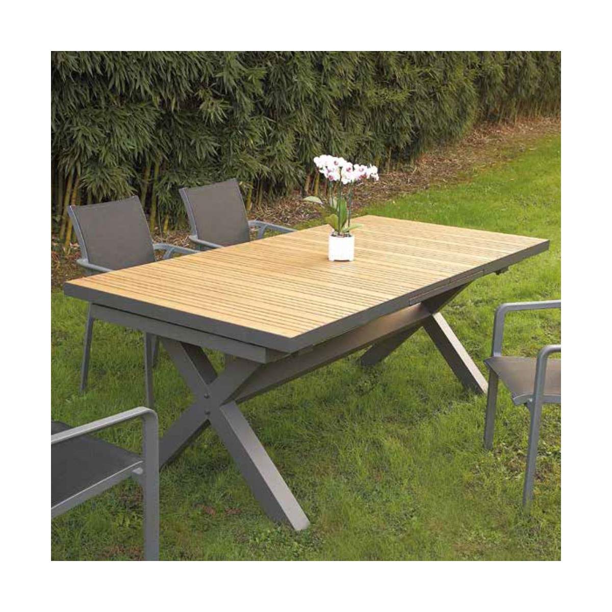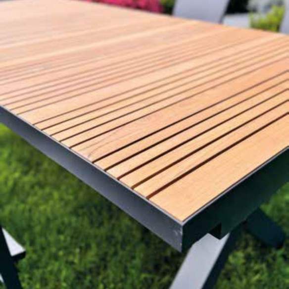 La struttura in alluminio verniciato antracite garantisce robustezza e leggerezza allo stesso tempo, mentre il piano è realizzato con listelli in teak massello, un materiale nobile e pregiato, noto per la sua straordinaria resistenza agli agenti atmosferici.