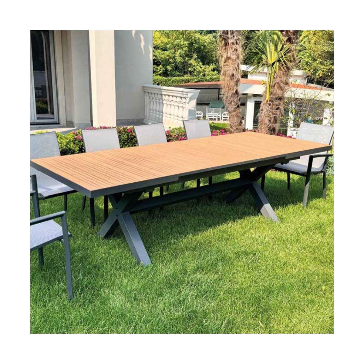 Con un’altezza di 76 cm, questo tavolo è studiato per garantire il massimo comfort sia nella versione chiusa che in quella allungata. Perfetto per chi ama organizzare pranzi e cene all’aperto, è un elemento d’arredo versatile e funzionale, capace di trasformare ogni spazio esterno in un ambiente raffinato e conviviale.
