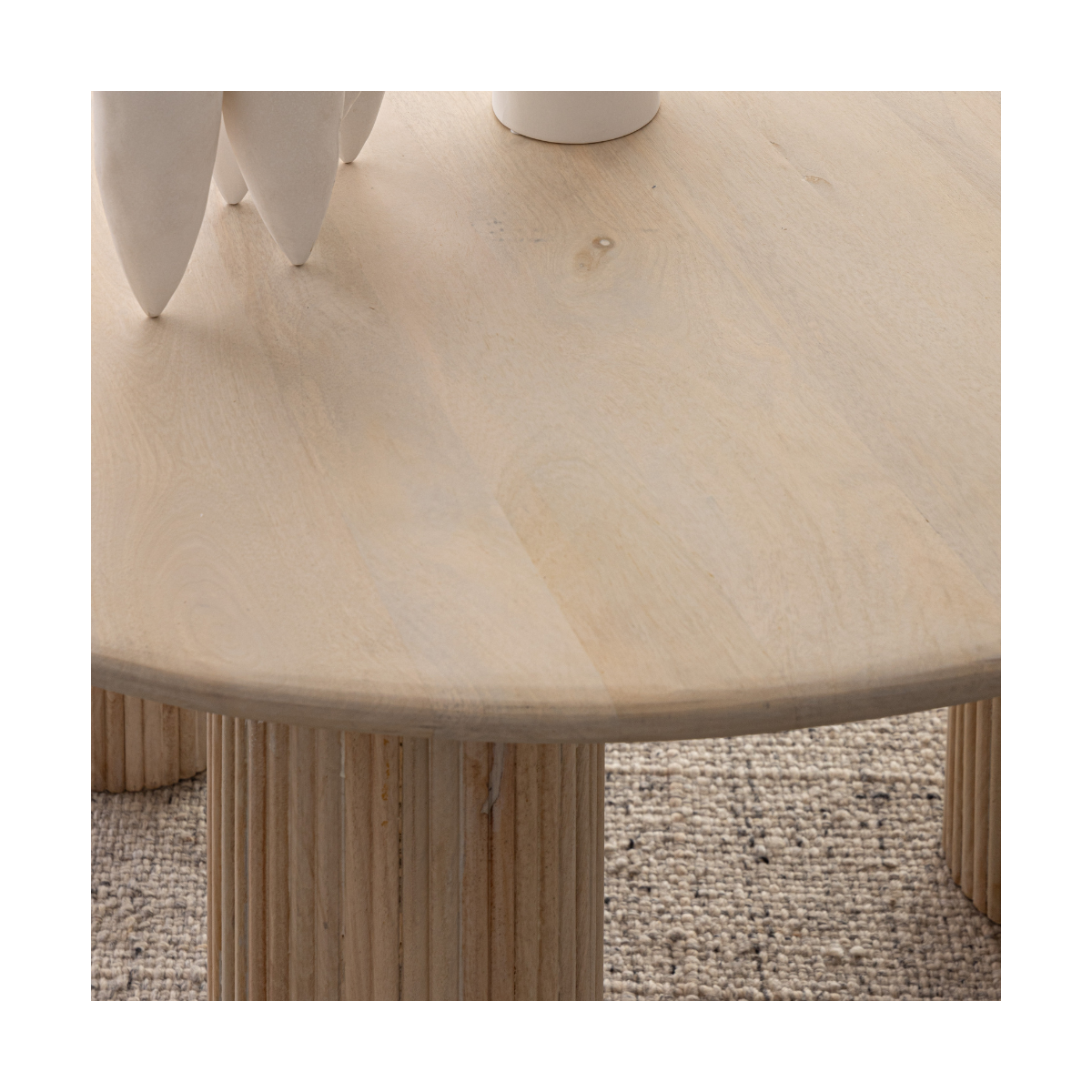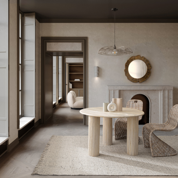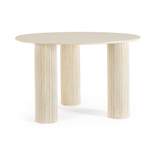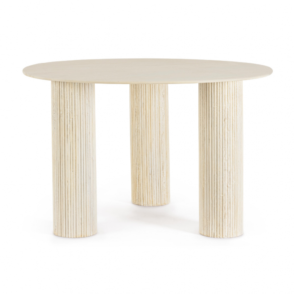 La finitura a base di nitrocellulosa esalta la texture materica del legno e offre una protezione durevole contro l’usura quotidiana, mantenendo nel tempo l’autenticità delle superfici. Il design rotondo favorisce la convivialità, creando uno spazio raccolto e accogliente perfetto per cene intime o colazioni in famiglia.