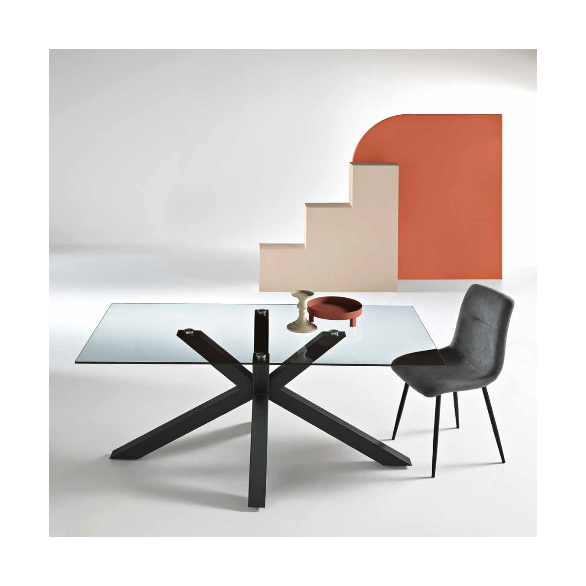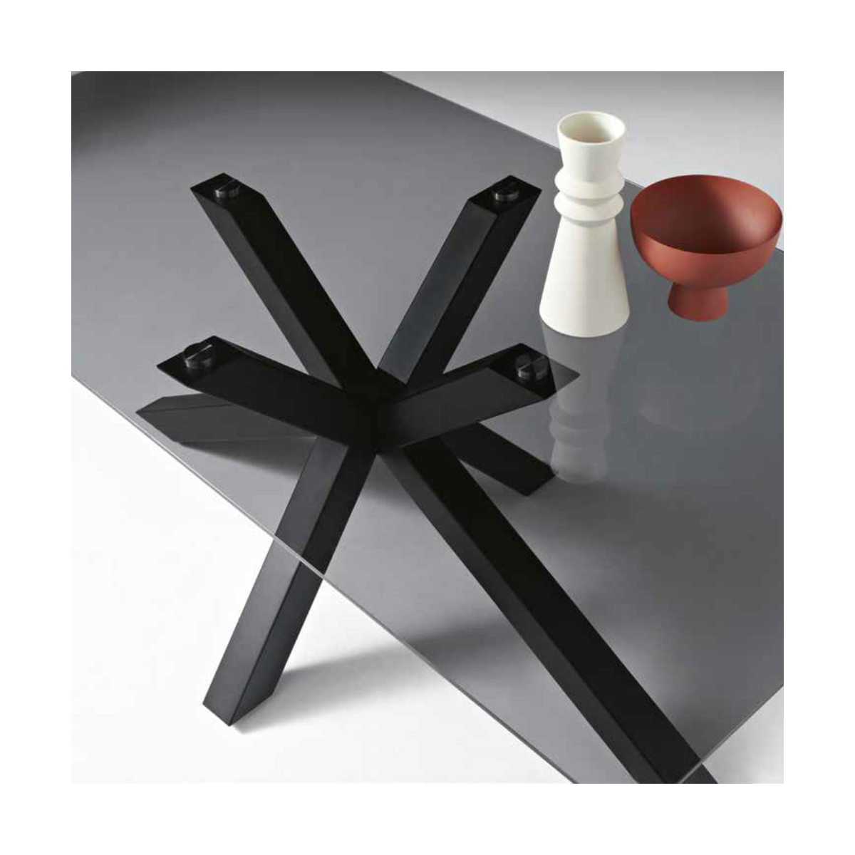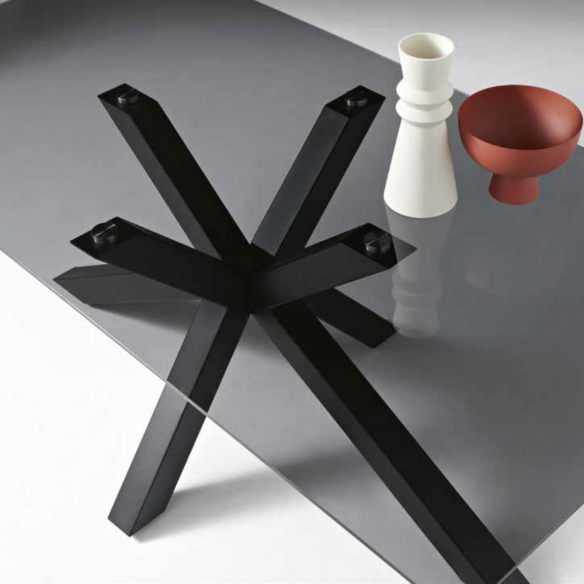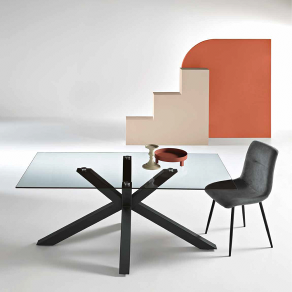 Tavolo fisso con piano in vetro e base in metallo. Disponibile in diverse misure e colori.